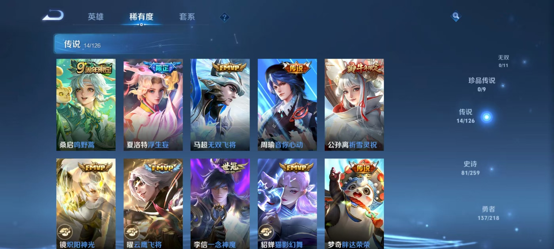 - PX_2088924-贵族等级: V5 英雄数: 102 皮肤数: 75 传说皮:镜炽阳神光,桑启鸣野蒿,云缨幻光神枪,澜愿照九州拓,公孙离云诺千山