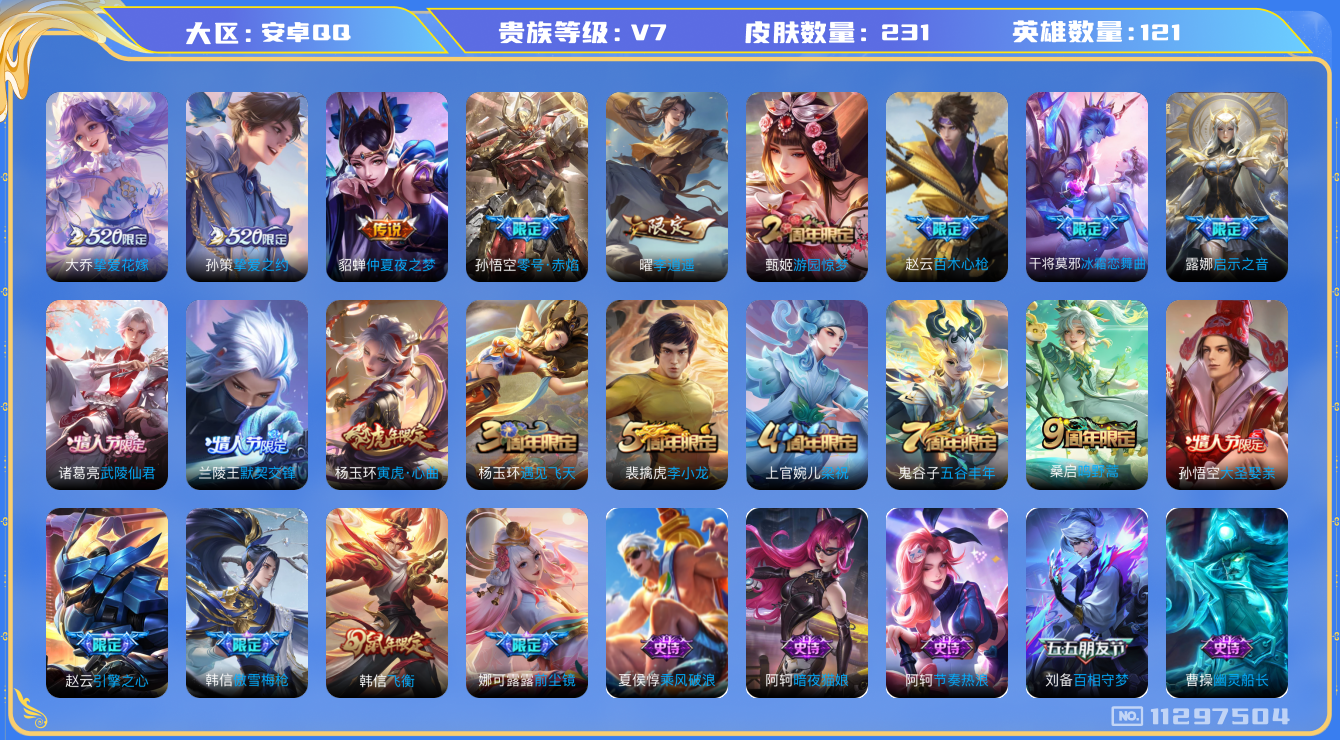 [11297504]V7 10传说 121英雄 231皮肤 可修改实名 优质装备:仲夏夜之梦(大飞蛾),零号·赤焰,李逍遥,挚爱之约,挚爱花嫁 珍宝阁皮:蔷薇恋人,女武神 限定皮:鸣野蒿,武陵仙君(小桃花),傲雪梅枪,前尘镜,飞衡(韩信年限),遇见飞天,五谷丰年,游园惊梦,梁祝,李小龙,默契交锋-兰陵王,大圣娶亲,引擎之心,冰霜恋舞曲,寅虎·心曲(虎婆),百木心枪,启示之音 史诗皮:紫霞仙子,苍穹之光,白龙吟,特工魅影,江河有灵,晚萤,电玩·爆裂旋风,百相守梦(刘备),暗夜猫娘,乱世虎臣,节奏热浪,修罗,女仆咖啡,水果甜心,星夜王子,暗隐猎兽者,幽灵船长,鬼剑武藏,纤云弄巧,拒霜思,缤纷独角兽,乘风破浪,逐浪之夏,水晶猎龙者,唤灵魅影,金属风暴,原初追逐者,圣诞恋歌,鹰眼统帅,魅力维加斯,黎明之约,赏金猎手,无心,未来纪元-赵云