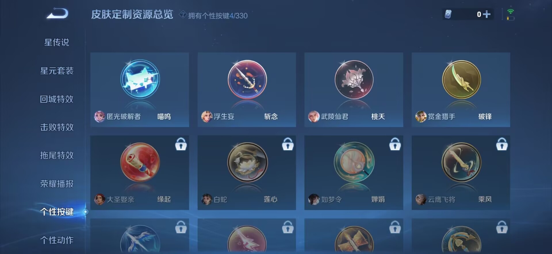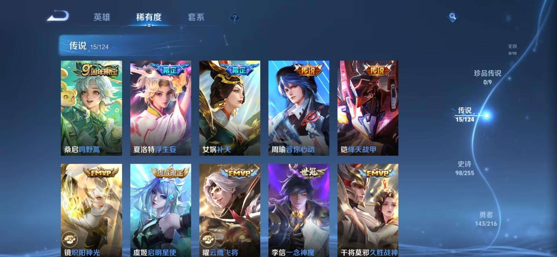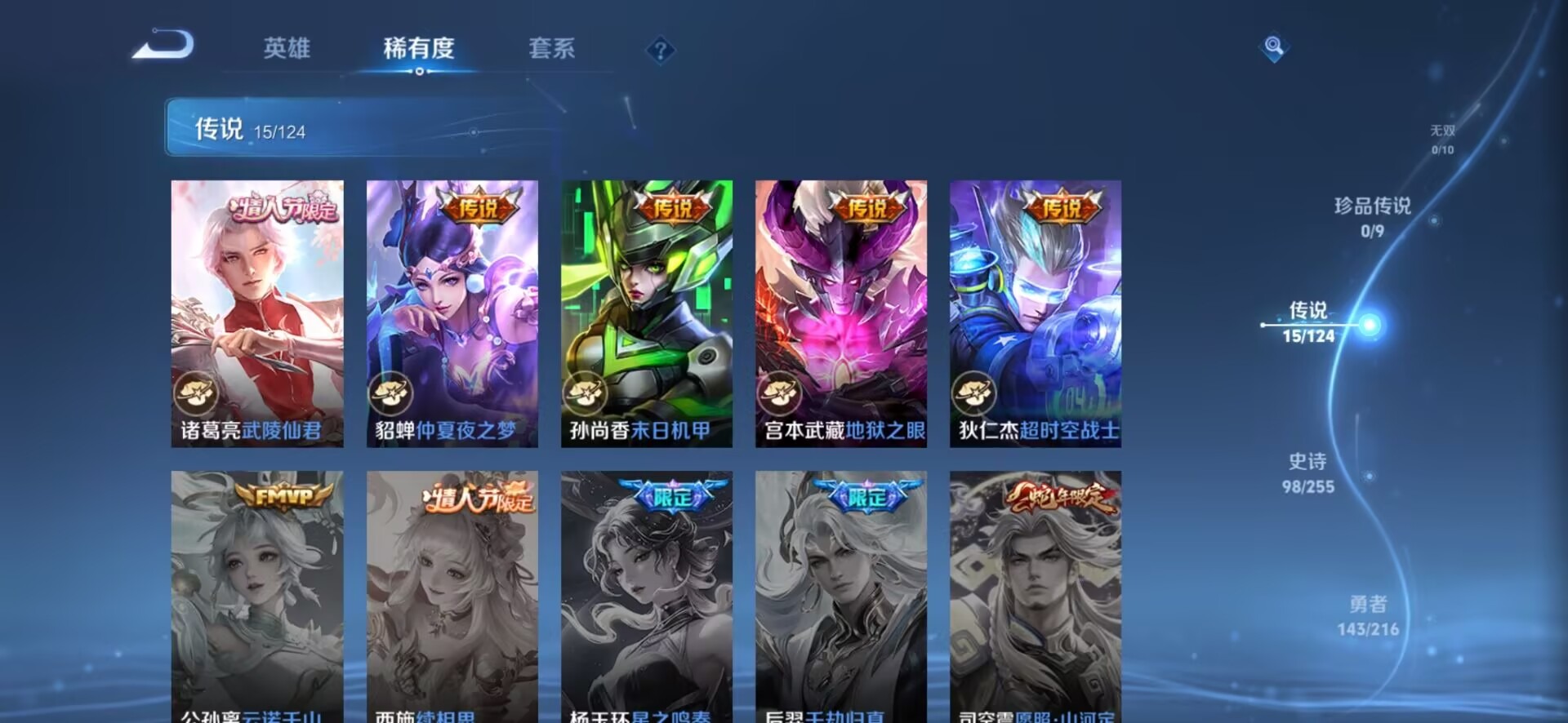 铠青龙志,曹操天狼征服者,伽罗天狼溯光者,张飞虎魄,后羿辉光之辰,公孙离玉兔公主,公孙离蜜橘之夏,裴擒虎李小龙,裴擒虎天狼狩猎者,上官婉儿梁祝,花木兰默契交锋,花木兰瑞麟志,西施至美·乘鲤谣,桑启鸣野蒿,猪八戒猪悟能,女娲补天,孙悟空大圣娶亲,孙悟空至尊宝,赵云引擎之心,韩信傲雪梅枪,关羽冰锋战神