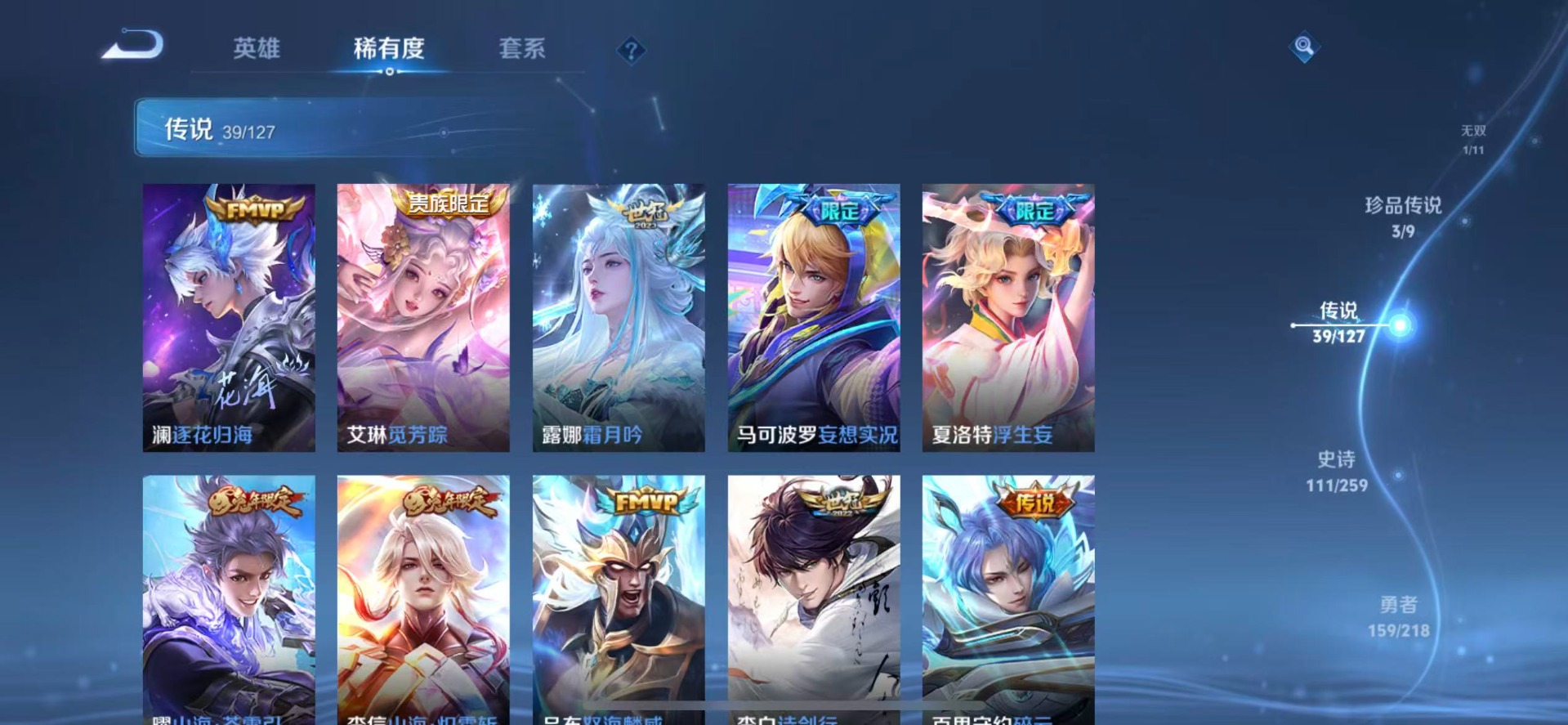 - [11790595]V5 4传说 118英雄 103皮肤 可修改实名 优质装备:无双飞将,澜逐花归海 传说皮:幻光神枪 珍宝阁皮:妄想食味 限定皮:李小龙,寅虎·赤拳(老虎年限) 史诗皮:江河有灵,百解令(蒙犽),电玩·爆裂旋风,水果甜心,天才门将,星夜王子,幽灵船长,纤云弄巧,拒霜思,金属风暴,鹰眼统帅,赏金猎手,未来纪元-赵云