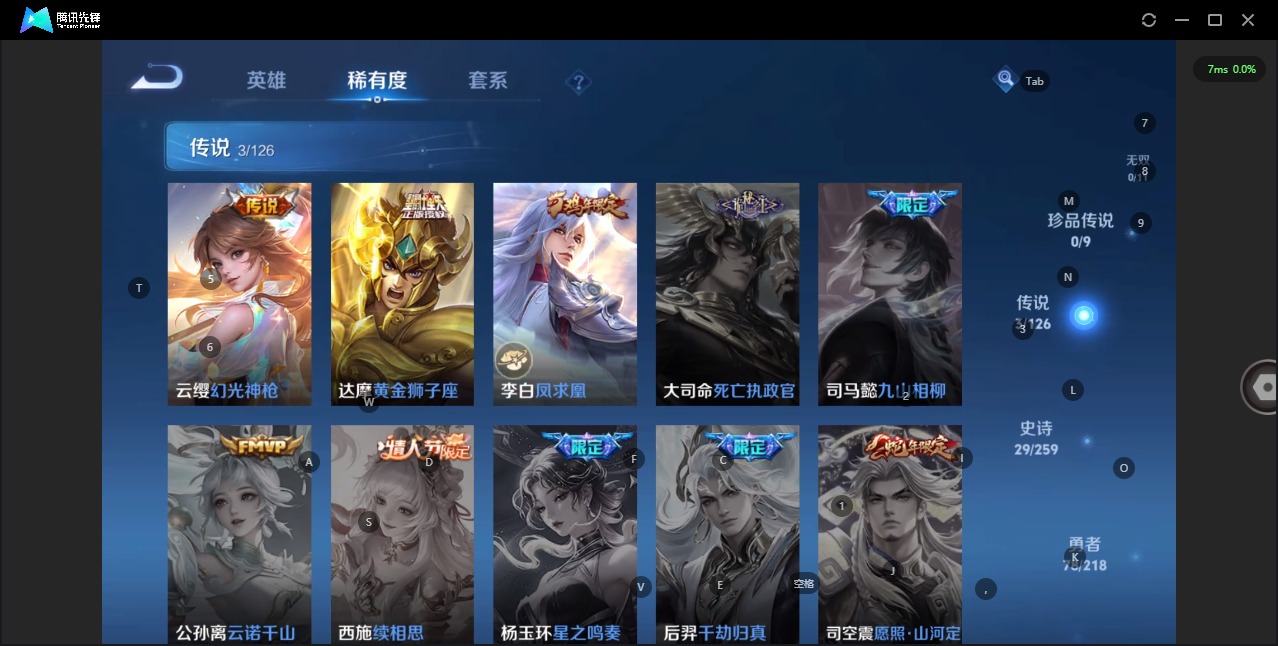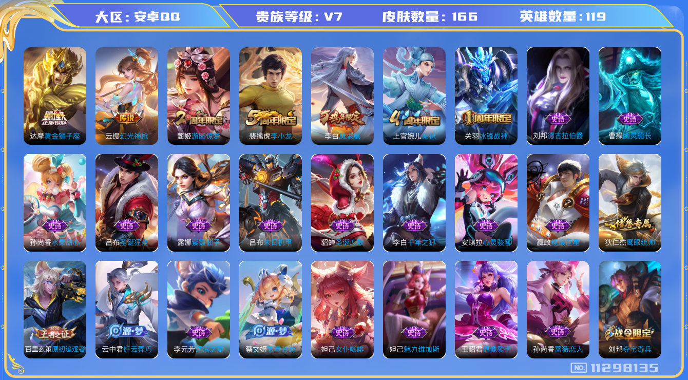 [11298135]V7 3传说 119英雄 166皮肤 可修改实名 优质装备:黄金狮子座 传说皮:幻光神枪 珍宝阁皮:蔷薇恋人 限定皮:凤求凰(白切鸡),冰锋战神,游园惊梦,梁祝,李小龙 史诗皮:紫霞仙子,千年之狐,偶像歌手,末日机甲-吕布,女仆咖啡,摇滚巨星,水果甜心,心灵骇客,德古拉伯爵,幽灵船长,纤云弄巧,繁星吟游(呼啦呼啦),逐浪之夏,原初追逐者,圣诞狂欢,圣诞恋歌,鹰眼统帅,魅力维加斯