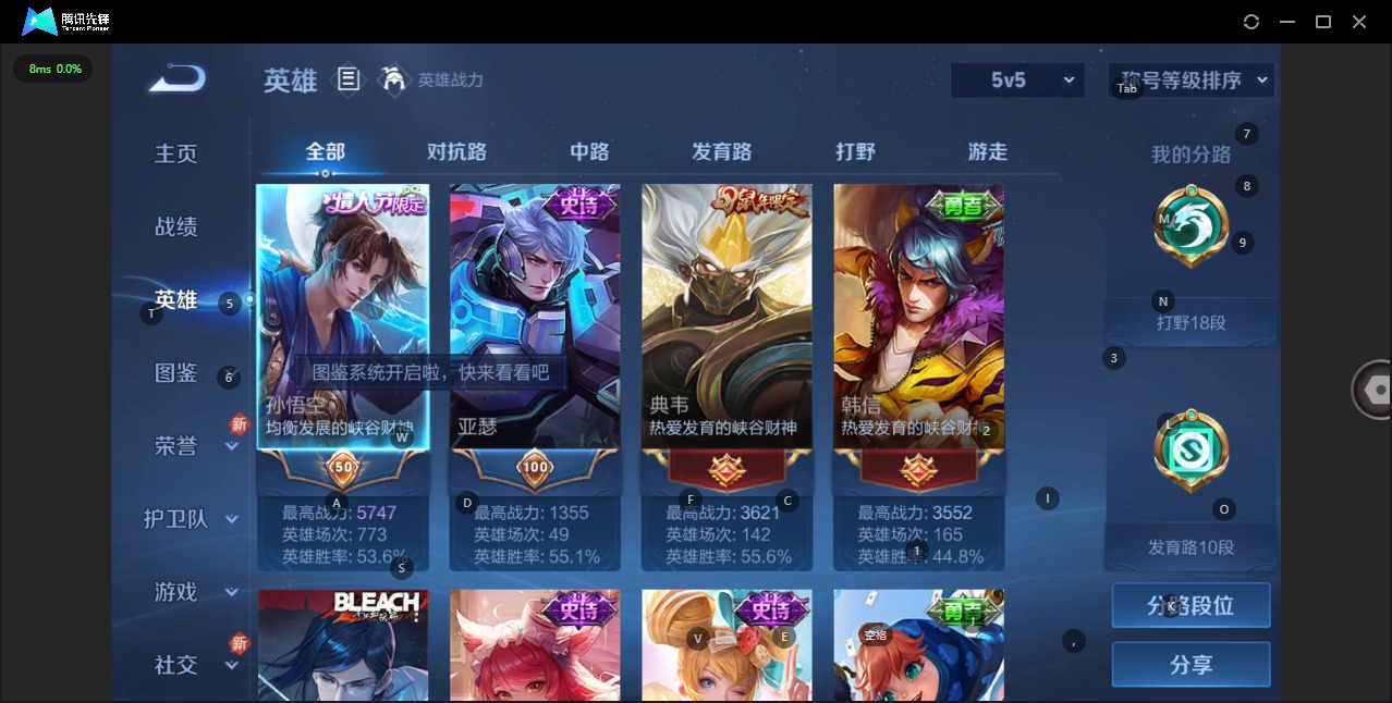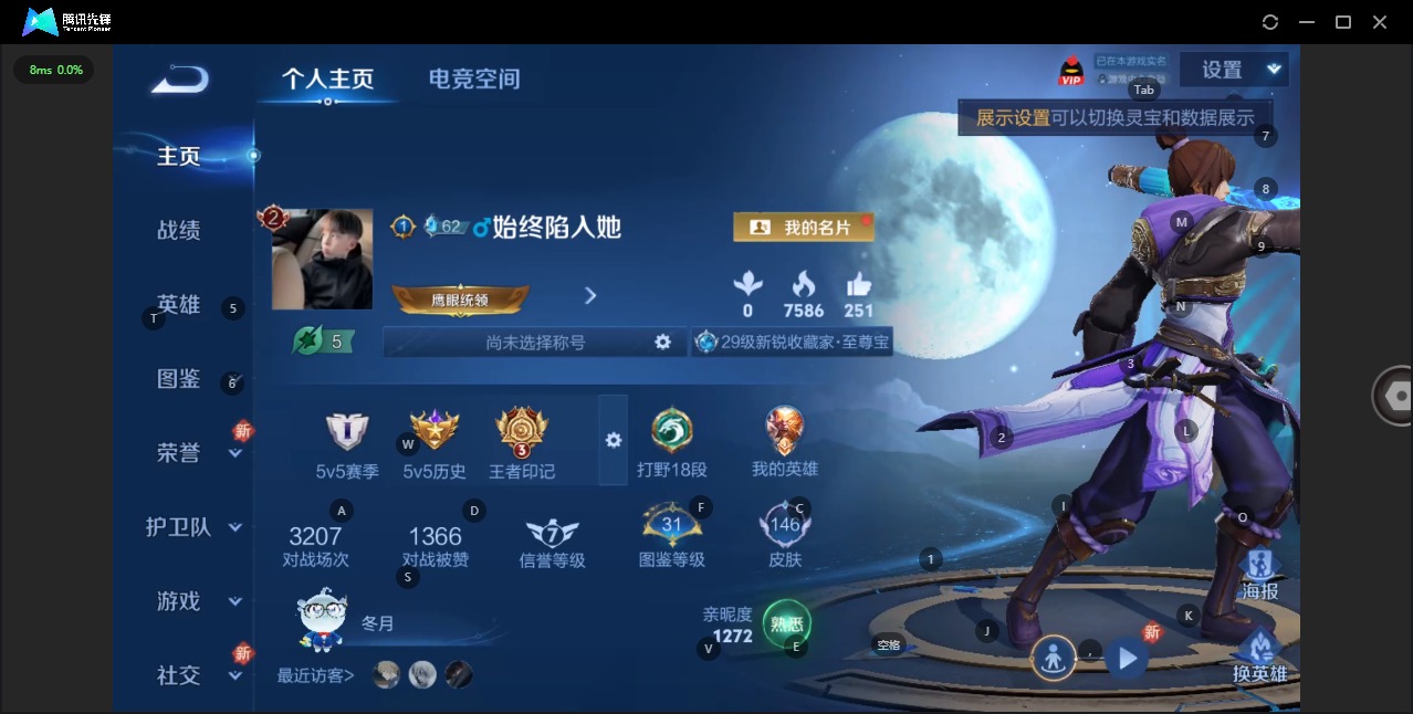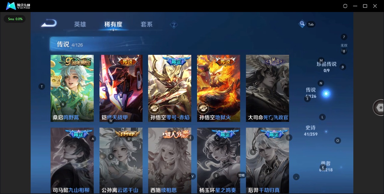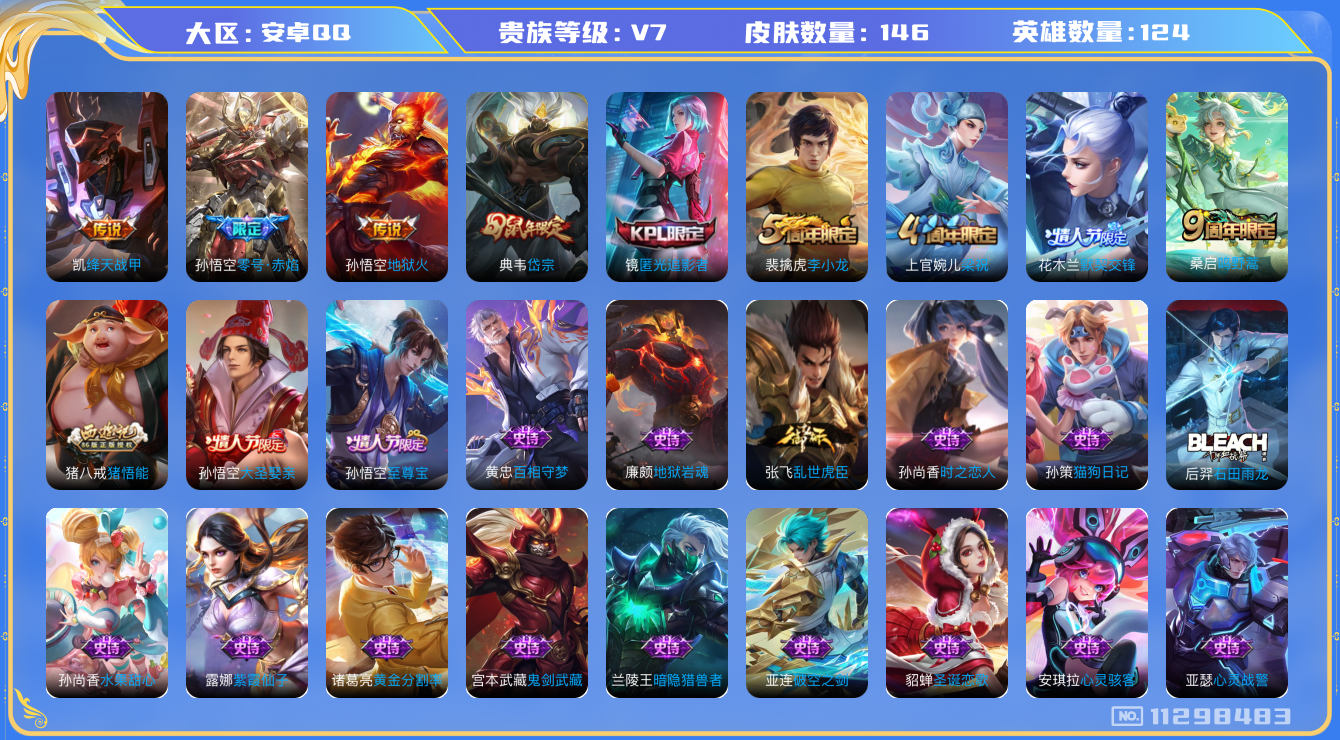 - [11688499]V8 1典藏 15传说 125英雄 319皮肤 可修改实名 优质装备:鸣剑·曳影,黄金狮子座,云鹰飞将(小将军),绛天战甲(鸡嘴战神),猫影幻舞,久胜战神,一念神魔,地狱火,零号·赤焰,地狱之眼,游龙清影(小青龙),末日机甲-孙策 传说皮:幻光神枪 珍宝阁皮:女武神,玩趣恶龙 限定皮:逐霄战戟,鸣野蒿,至尊宝,傲雪梅枪,白鹤梁神女,魔法小厨娘,时雨天司(水龙头),神威(电光马子),遇见飞天,高山流水,五谷丰年,冰锋战神,天狼运算者,游园惊梦,梁祝,御风骁将(吕布年限),天狼溯光者,李小龙,朱雀志(守约年限),圣诞老人,默契交锋-花木兰,孙行者,猪悟能,大圣娶亲 史诗皮:化蝶舞,紫霞仙子,电玩小子(小书包),白龙吟,特工魅影,千年之狐,永昼,江河有灵,魅语,百解令(蒙犽),蒙恬荣光圣徽,冰冠公主,偶像歌手,晚萤,电玩·爆裂旋风,暗夜猫娘,龙骑士(小龙虾),末日机甲-吕布,猫狗日记-孙策,乱世虎臣,节奏热浪,修罗,女仆咖啡,摇滚巨星,水果甜心,绅士熊喵,天才门将,星夜王子,心灵骇客,时之奇旅-安琪拉,功夫厨神,德古拉伯爵,暗隐猎兽者,幽灵船长,鬼剑武藏,心灵战警,天秀·启明,舞动绿茵,地狱岩魂,纤云弄巧,拒霜思,缤纷独角兽,乘风破浪,逐浪之夏,水晶猎龙者,金属风暴,原初追逐者,圣诞狂欢,圣诞恋歌,鹰眼统帅,暗夜贵公子,魅力维加斯,黎明之约,无心,未来纪元-赵云