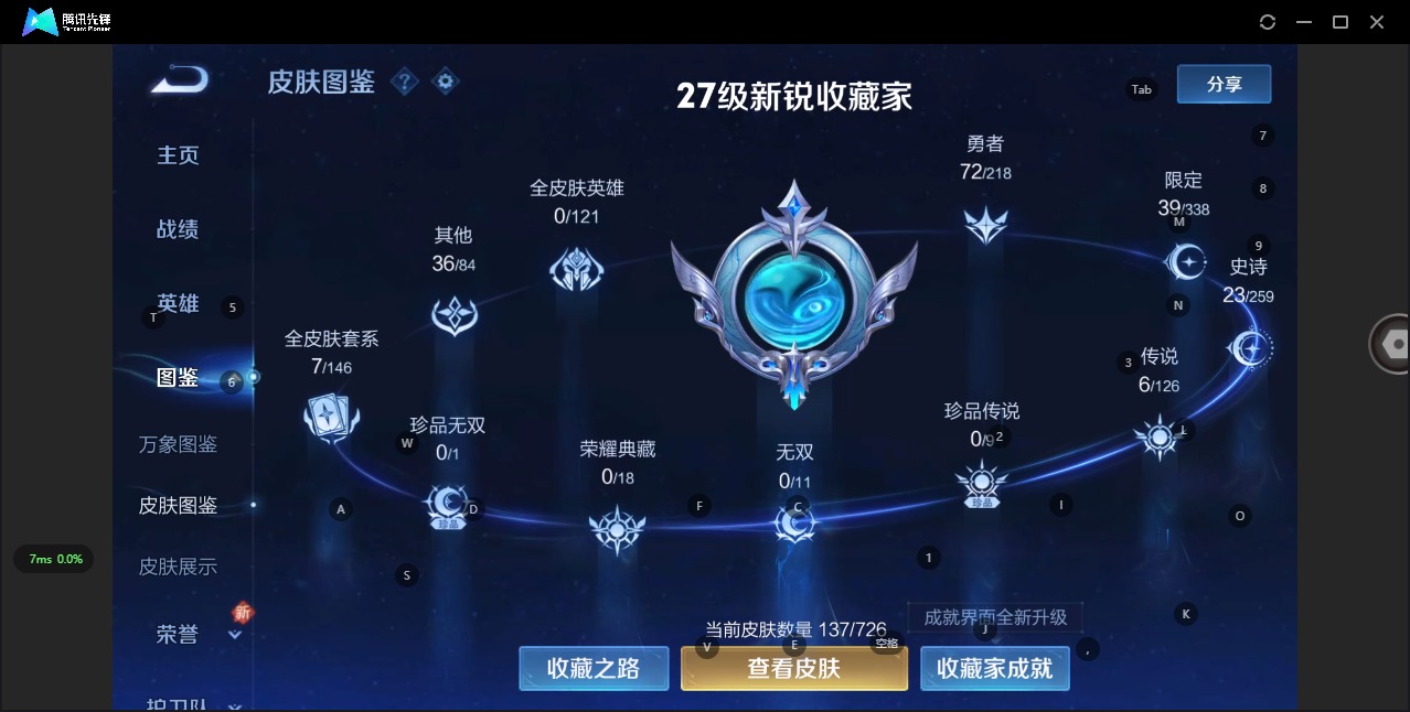 [11299075]V7 6传说 125英雄 137皮肤 可修改实名 优质装备:末日机甲-孙尚香(绿蚂蚱),地狱火,胖达荣荣,超时空战士-狄仁杰 珍宝阁皮:胡桃夹子 限定皮:愿照·千秋盛(女娲年限),鸣野蒿 史诗皮:器灵·浮梦炉,星界战将,百相守梦-黄忠,特工魅影,千年之狐,魅语,修罗,女仆咖啡,德古拉伯爵,暗隐猎兽者,幽灵船长,鬼剑武藏,水晶猎龙者,金属风暴,圣诞狂欢,圣诞恋歌,鹰眼统帅,暗夜贵公子,魅力维加斯,黎明之约