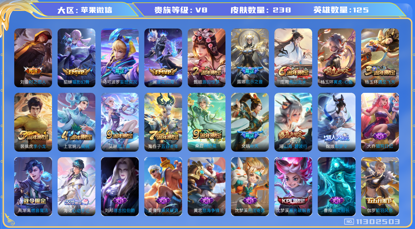 [11302503]V8 7传说 125英雄 238皮肤 可修改实名 安全保护中 传说皮:猫影幻舞,时之恋人-刘备(电焊工),妄想实况,澜逐花归海 珍宝阁皮:万物之道,优雅恋人,玩趣恶龙 限定皮:陌上桑,鸣野蒿,补天,山海·碧波行(瑶年限),遇见飞天,高山流水,五谷丰年,游园惊梦,梁祝,李小龙,如梦令-嫦娥,寅虎·心曲(虎婆),启示之音 史诗皮:星界战将,茶境仙,鸭鸭历险记-刘禅,灵蛊蚀心,龙之律动,石田雨龙,百相守梦-百里守约,怒海争锋,海诺心动手记,上官婉儿群星魔术团,乘龙·聚宝船(安琪拉年限),炽弈燎原,百相守梦-周瑜,破空之剑,苍穹之光,黄金分割率,特工魅影,千年之狐,江河有灵,高渐离燃音魔法,百解令(蒙犽),匿光破解者,蒙恬荣光圣徽,晚萤,魅语,银翎春语,猫狗日记-大乔,乱世虎臣,修罗,女仆咖啡,摇滚巨星,水果甜心,星夜王子,心灵骇客,功夫厨神,德古拉伯爵,暗隐猎兽者,幽灵船长,鬼剑武藏,暗渊魔法,心灵战警,乐园奇幻夜,天秀·启明,诗语江南,纤云弄巧,拒霜思,缤纷独角兽,乘风破浪,逐浪之夏,月团寄思,水晶猎龙者,箭羽风息,唤灵魅影,金属风暴,原初追逐者,圣诞狂欢,圣诞恋歌,鹰眼统帅,魅力维加斯,黎明之约,滕王阁序,无心,未来纪元-赵云