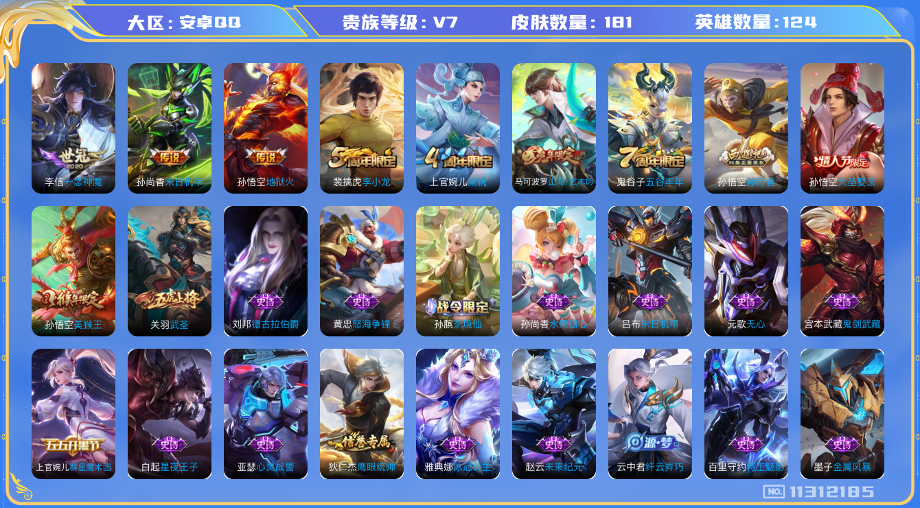 [11312185]V7 4传说 124英雄 181皮肤 可修改实名 优质装备:一念神魔,末日机甲-孙尚香(绿蚂蚱),地狱火 珍宝阁皮:女武神 限定皮:五谷丰年,武圣,梁祝,李小龙,孙行者,大圣娶亲,美猴王,山海·玄木吟(马可年限) 史诗皮:茶境仙,怒海争锋,上官婉儿群星魔术团,特工魅影,冰冠公主,偶像歌手,末日机甲-吕布,水果甜心,星夜王子,德古拉伯爵,鬼剑武藏,心灵战警,纤云弄巧,拒霜思,金属风暴,鹰眼统帅,无心,未来纪元-赵云