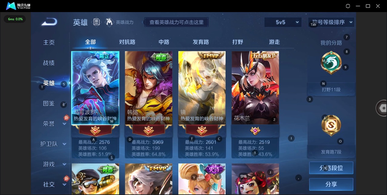 [11298398]V6 5传说 78英雄 49皮肤 可修改实名 优质装备:云鹰飞将(小将军),炽阳神光,超时空战士-狄仁杰 限定皮:五谷丰年,天狼狩猎者,无尽星芒,深海之息(深海大菠萝) 史诗皮:水果甜心,星夜王子,水晶猎龙者,鹰眼统帅,魅力维加斯,无心