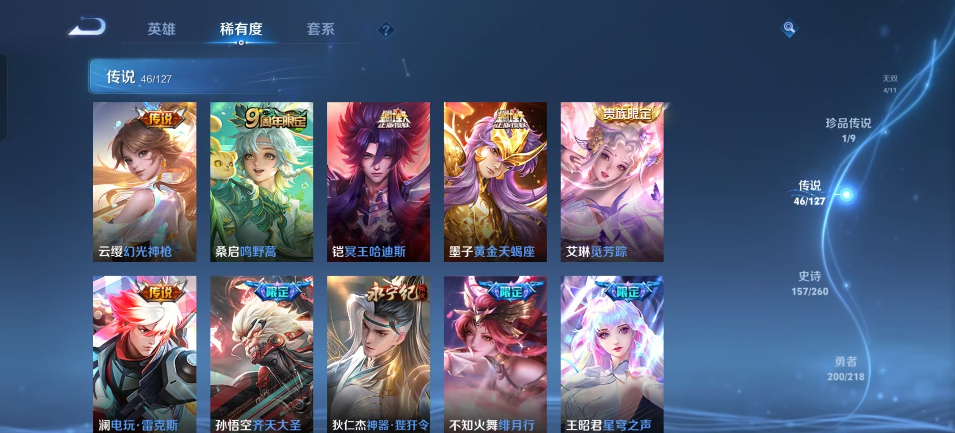 大乔白鹤梁神女,金蝉唐三藏,夏侯惇匿光决锋者,铠青龙志,盾山梦圆繁星,曹操天狼征服者,伽罗天狼溯光者,伽罗太华,苏烈玄武志,张飞虎魄,孙膑天狼运算者,典韦岱宗,孙尚香异界灵契,不知火舞绯月行,牛魔奔雷神使,鲁班七号乒乒小将,项羽霸王别姬,后羿无尽星芒,吕布御风骁将,后羿如梦令,后羿辉光之辰,诸葛亮时雨天司,裴擒虎李小龙,上官婉儿梁祝,上官婉儿神器·万象笔,上官婉儿天狼绘梦者,花木兰瑞麟志,安琪拉魔法小厨娘,马可波罗深海之息,桑启鸣野蒿,猪八戒猪悟能,孙悟空孙行者,孙悟空大圣娶亲,孙悟空至尊宝,芈月白晶晶,马超神威,雅典娜神奇女侠,赵云引擎之心,妲己时之奇旅,韩信飞衡,韩信逐梦之影,百里守约朱雀志,蔡文姬奇迹圣诞,虞姬霸王别姬,王昭君凤凰于飞,王昭君星穹之声,关羽武圣,关羽冰锋战神