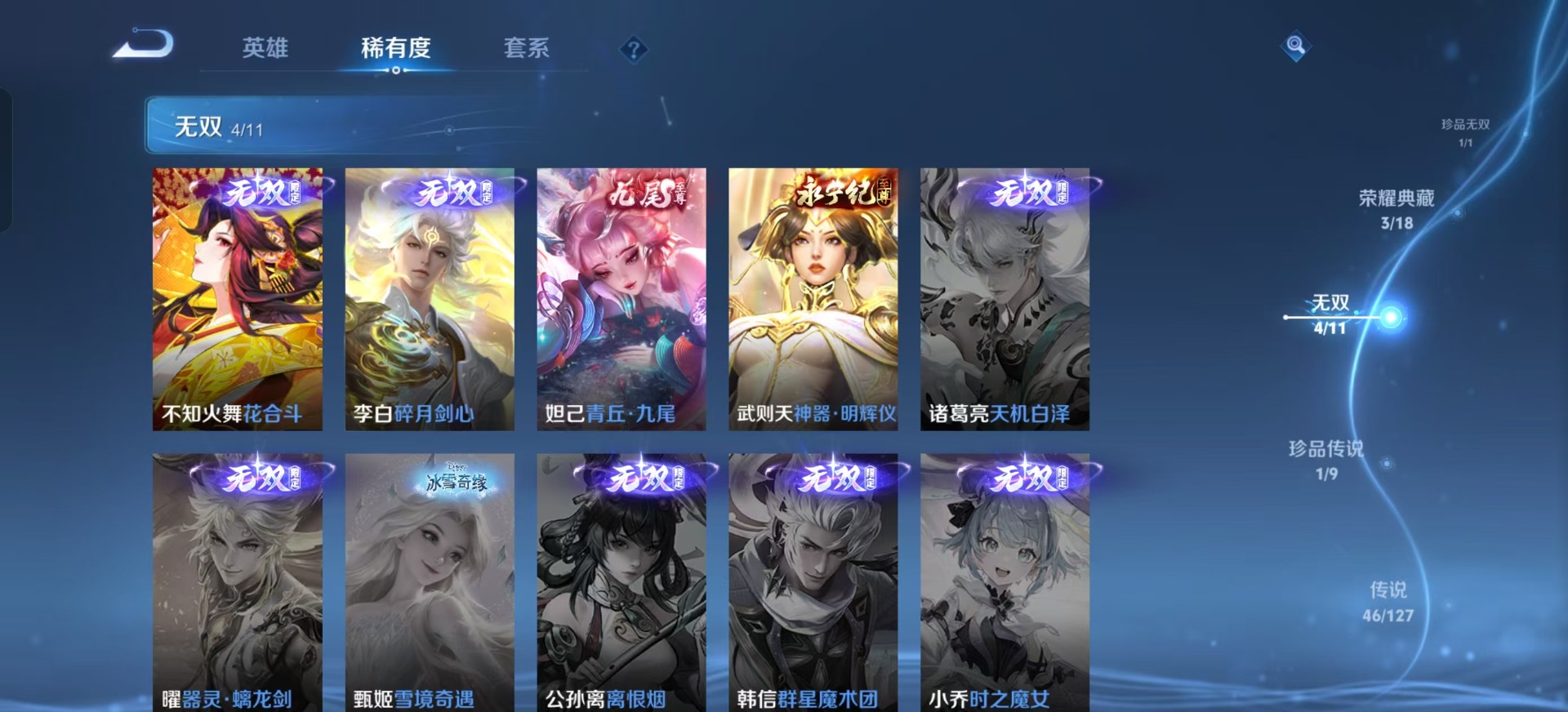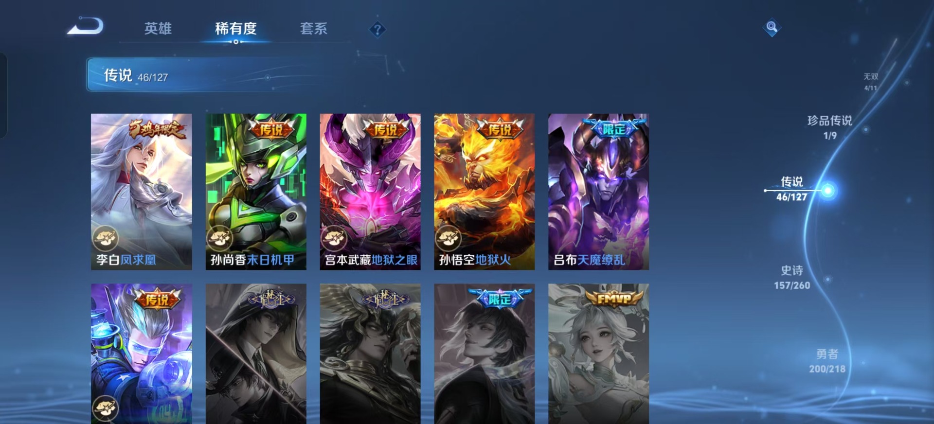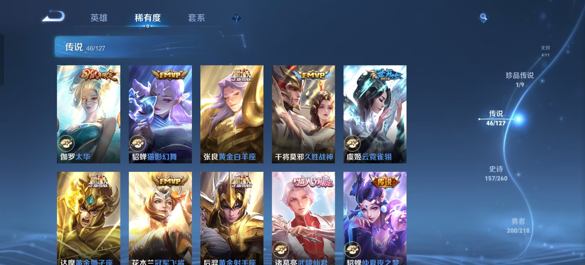 - PX_2097223-43 安卓微信/最强王者/162皮肤/124英雄/2典藏/0珍品无双/3无双/0珍品传说/11传说/55史诗/8稀有英雄 【2 典藏皮肤】鸣剑·曳影 李白,幻阙歌 貂蝉, 【3 无双皮肤】时之魔女 小乔,离恨烟 公孙离,群星魔术团 韩信, 【11 传说皮肤】启明星使 虞姬,无双飞将 马超,零号·赤焰 孙悟空,云鹰飞将 曜,落雪白狼 亚连,时之恋人 刘备,天魔缭乱 吕布,乘龙·