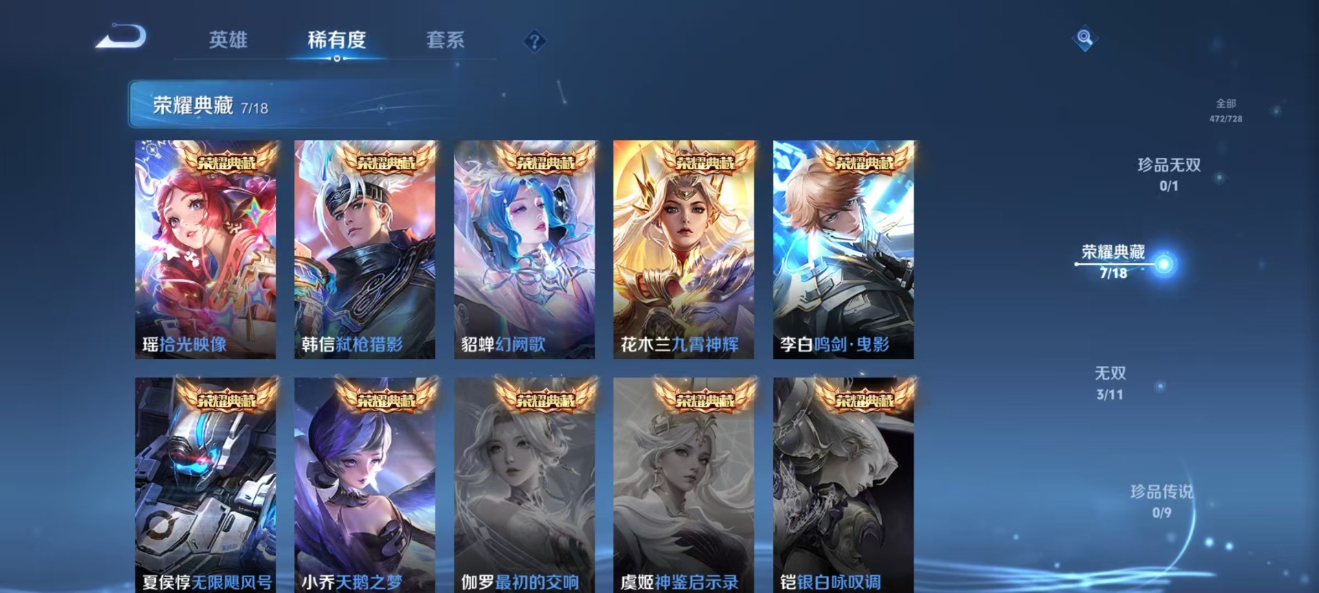 夏侯惇无限飓风号,小乔天鹅之梦,花木兰九霄神辉,李白鸣剑·曳影,韩信弑枪猎影,瑶拾光映像,貂蝉幻阙歌