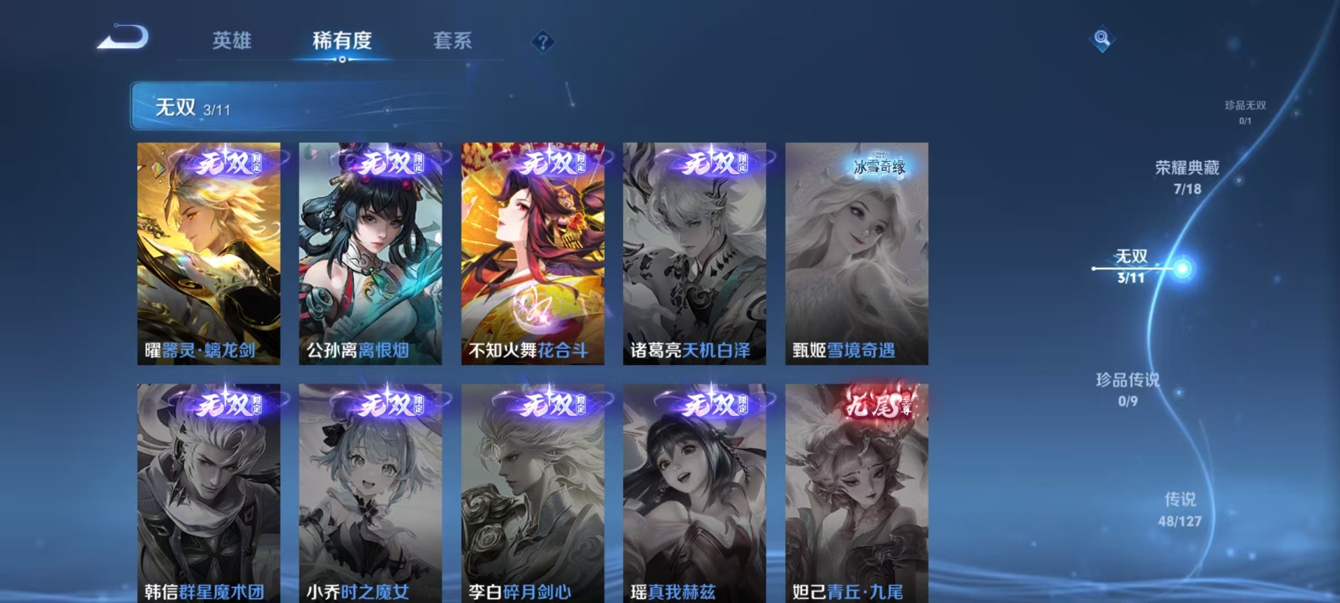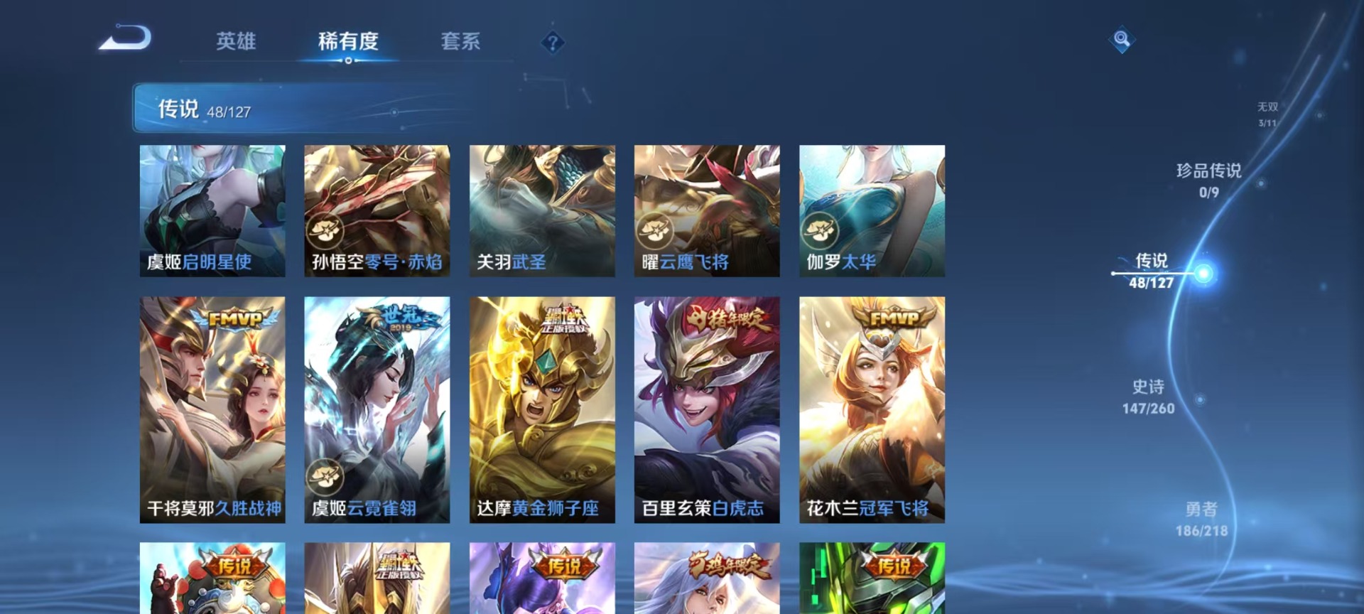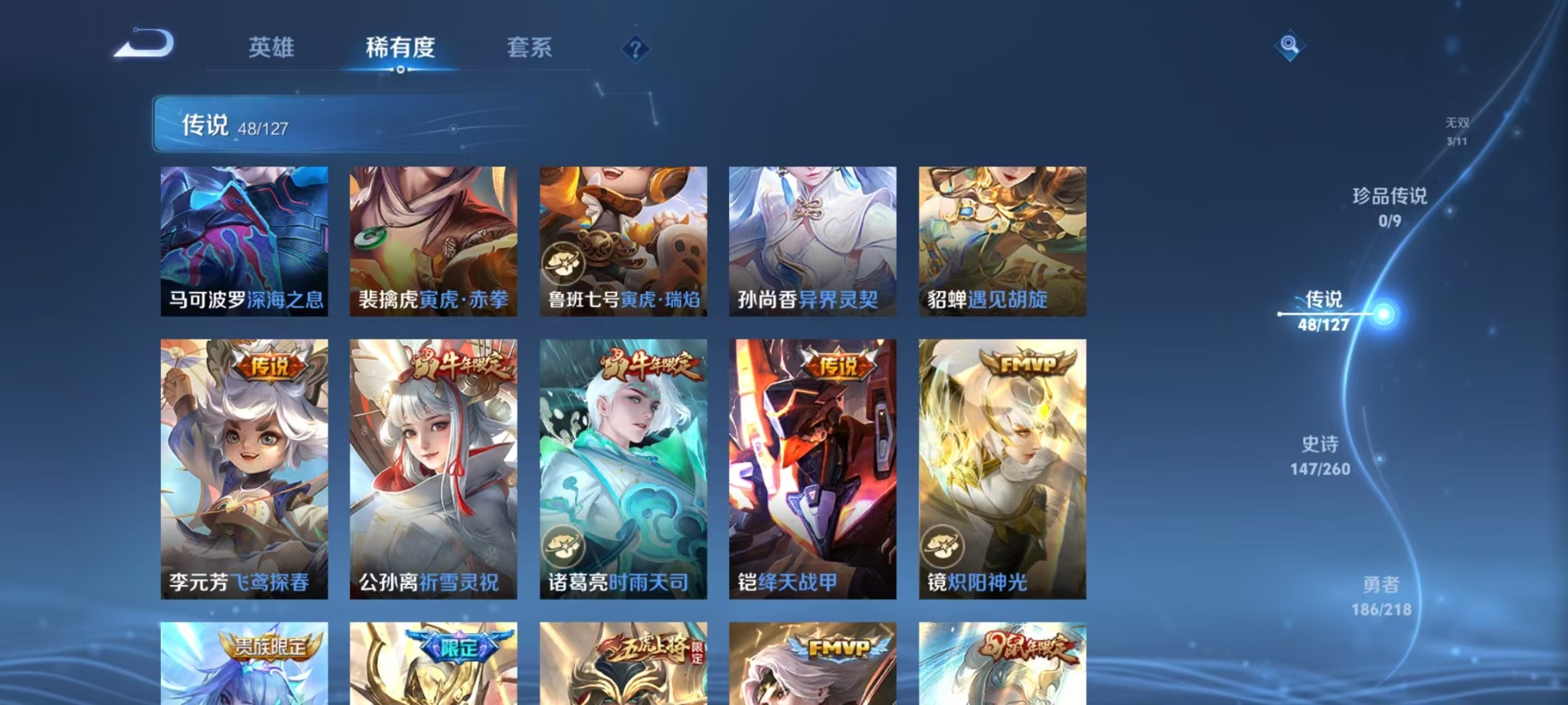 大乔白鹤梁神女,夏侯惇霜北刀,廉颇寅虎·御盾,曹操天狼征服者,伽罗天狼溯光者,伽罗太华,孙膑天狼运算者,干将莫邪冰霜恋舞曲,孙尚香异界灵契,鲁班七号寅虎·瑞焰,吕布御风骁将,后羿如梦令,镜匿光追影者,庄周云端筑梦师,诸葛亮时雨天司,杨玉环寅虎·心曲,公孙离祈雪灵祝,司空震愿照·山河定,兰陵王影龙天霄,公孙离蜜橘之夏,貂蝉逐梦之音,裴擒虎李小龙,裴擒虎寅虎·赤拳,上官婉儿梁祝,花木兰默契交锋,花木兰瑞麟志,花木兰青春决赛季,安琪拉魔法小厨娘,马可波罗逐梦之星,马可波罗山海·玄木吟,马可波罗深海之息,桑启鸣野蒿,猪八戒猪悟能,女娲愿照·千秋盛,孙悟空孙行者,孙悟空大圣娶亲,芈月白晶晶,孙悟空至尊宝,孙悟空美猴王,百里玄策白虎志,马超神威,雅典娜神奇女侠,赵云引擎之心,妲己愿照·众生和,韩信傲雪梅枪,韩信逐梦之影,百里守约朱雀志,蔡文姬奇迹圣诞,蔡文姬愿照·福禄聚,澜愿照·九州拓,虞姬霸王别姬,虞姬愿照·岁时盈,嫦娥如梦令,关羽武圣,关羽冰锋战神