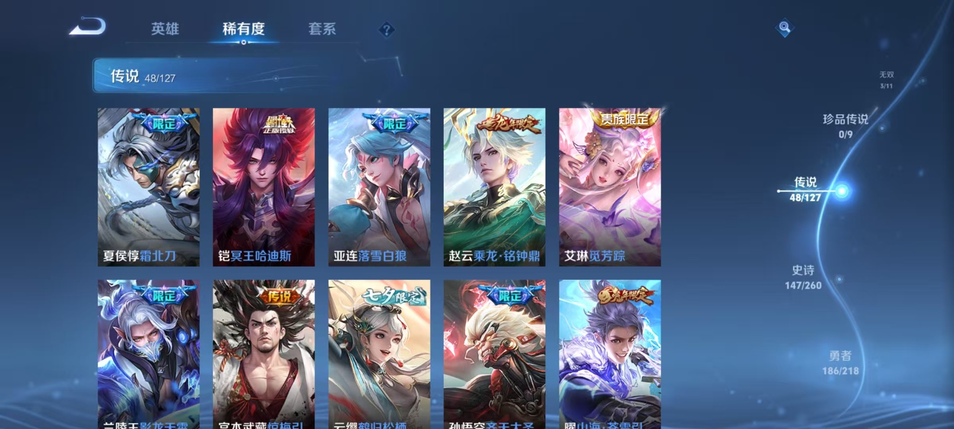 - [11605382]V7 1典藏 6传说 125英雄 332皮肤 可修改实名 女号 优质装备:全息碎影(猴子典藏),地狱火,胖达荣荣 传说皮:乘龙·铭钟鼎(赵云年限),幻光神枪 珍宝阁皮:优雅恋人,蔷薇恋人,女武神 限定皮:愿照·九州拓(澜年限),逐霄战戟,鸣野蒿,飞衡(韩信年限),遇见飞天,高山流水,五谷丰年,梁祝,御风骁将(吕布年限),天狼征服者,李小龙,孙行者,猪悟能,引擎之心,冰霜恋舞曲,百木心枪,玉兔公主 史诗皮:化蝶舞,龙之律动,石田雨龙,谪仙醉月,决胜骁骑,蔬乡物语(鲁班七号),百相守梦-黄忠,紫霞仙子,电玩小子(小书包),白龙吟,黄金分割率,特工魅影,千年之狐,电玩·爆裂旋风,江河有灵,百解令(蒙犽),高渐离燃音魔法,晚萤,末日机甲-吕布,猫狗日记-孙策,猫狗日记-大乔,时之恋人-孙尚香,节奏热浪,修罗,女仆咖啡,摇滚巨星,水果甜心,绅士熊喵,星夜王子,心灵骇客,德古拉伯爵,暗隐猎兽者,幽灵船长,鬼剑武藏,暗渊魔法,心灵战警,天秀·启明,舞动绿茵,地狱岩魂,纤云弄巧,繁星吟游(呼啦呼啦),拒霜思,缤纷独角兽,乘风破浪,逐浪之夏,水晶猎龙者,曙光守护者,热力回旋,金属风暴,圣诞狂欢,圣诞恋歌,鹰眼统帅,暗夜贵公子,无心,未来纪元-赵云