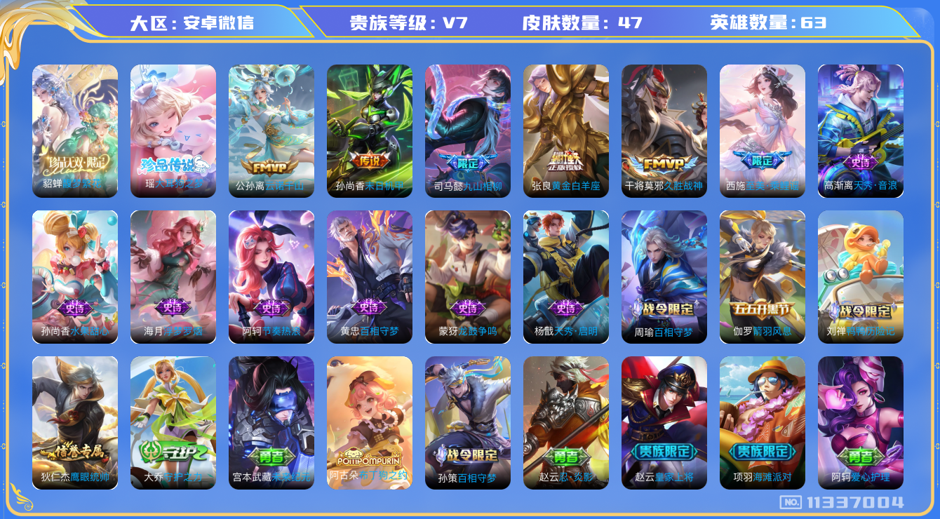 [11337004]V7 1珍品无双 1珍品传说 5传说 63英雄 47皮肤 可修改实名 优质装备:馥梦繁花,大耳狗之梦,黄金白羊座,久胜战神,末日机甲-孙尚香(绿蚂蚱) 传说皮:九山相柳,云诺千山 限定皮:至美·乘鲤谣 史诗皮:鸭鸭历险记-刘禅,百相守梦-周瑜,百相守梦-黄忠,浮梦罗烟,节奏热浪,水果甜心,天秀·启明,龙鼓争鸣,箭羽风息,鹰眼统帅,天秀·音浪