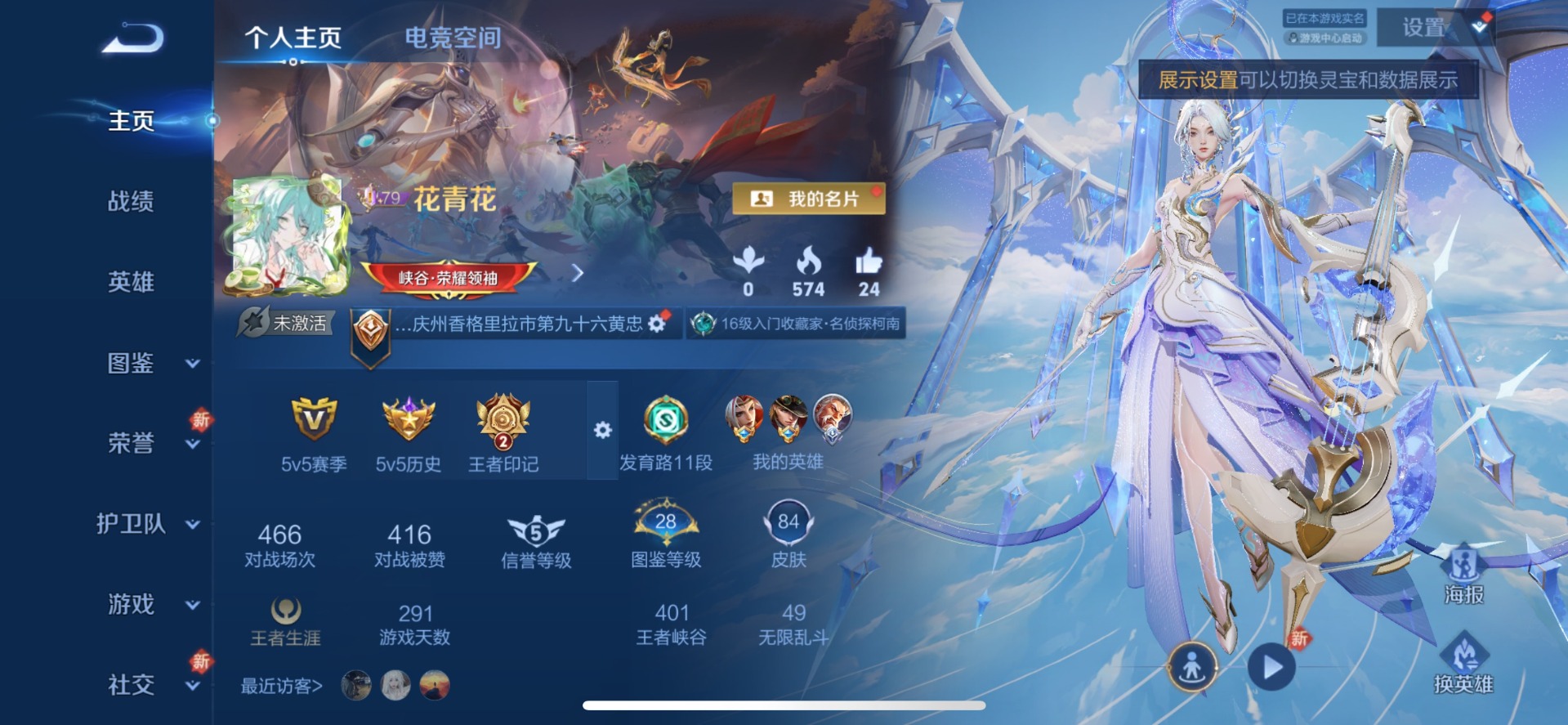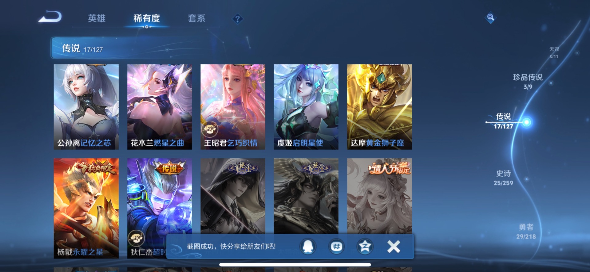 - PX_2095935-实名: 可修改 贵族等级: V5 英雄数: 124 皮肤数: 163 传说皮: 乘龙·问璇玑 限定皮: 李小龙,梁祝,御风骁将,引擎之心,飞衡,大圣娶亲,五谷丰年,山海·玄木吟,鸣野蒿,逐霄战戟