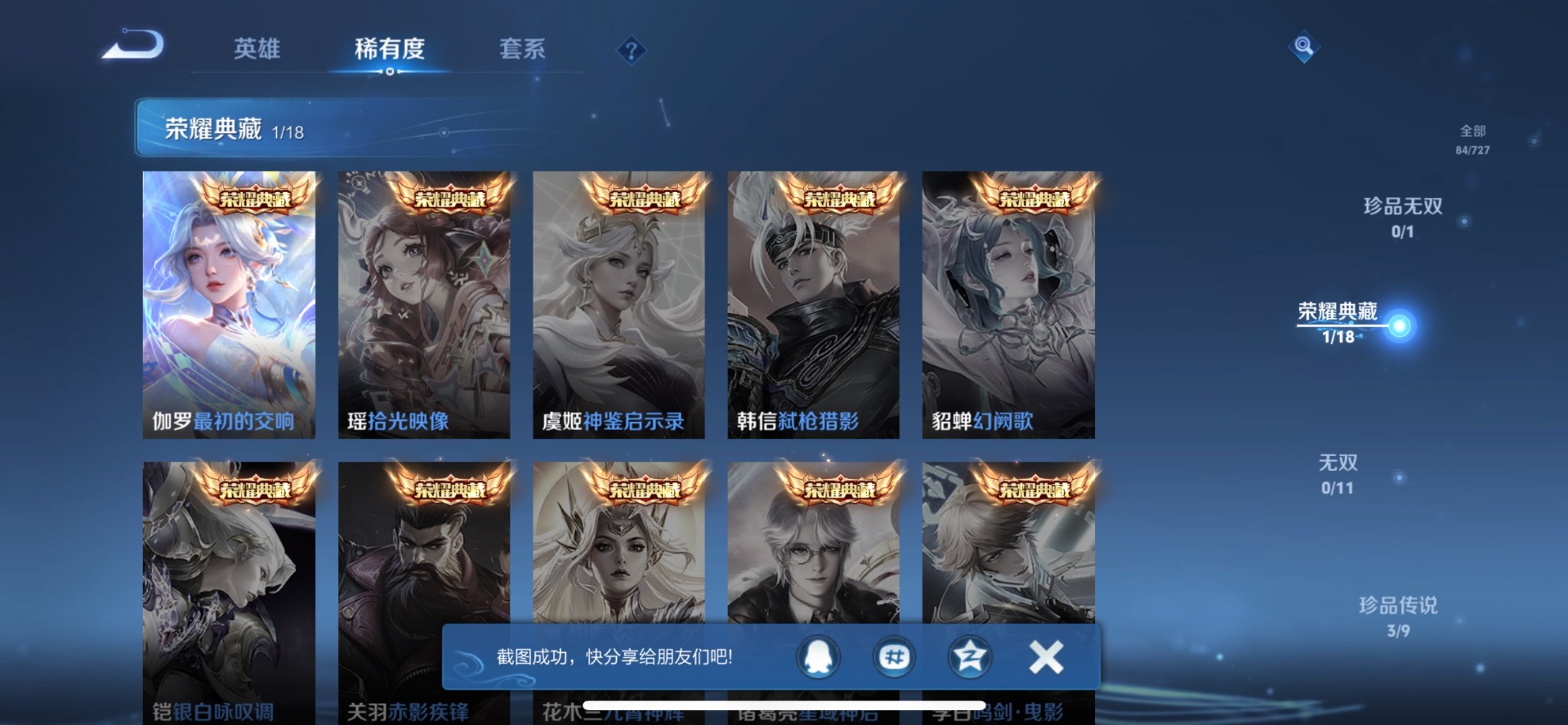 - PX_2053878-安卓Q 【可二次】 英雄数量:126 皮肤数量:656 贵族等级:贵族V10 【星传说 苍灵仙君 乞巧织春 无限倾慕 玉鸾呤 时之愿境 时之思念 幻海之心 星际治安官 未来机甲 金色仲夏夜】无双限定9 荣耀典藏14 珍品传说6 传说品质110 史诗品质211武则天 花合斗 离恨烟 韩信群星魔术团 甄姬雪境奇遇 青丘·九尾 真我赫兹瑶 碎月剑心 时之魔女 神器·明辉仪 幻阙歌