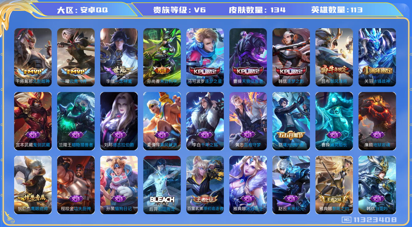 - [12087112]V7 1典藏 8传说 124英雄 261皮肤 可修改实名 优质装备:九霄神辉(木兰典藏),久胜战神,地狱火,地狱之眼,无双飞将 传说皮:乘龙·铭钟鼎(赵云年限) 珍宝阁皮:蔷薇恋人,玩趣恶龙 限定皮:逐霄战戟,鸣野蒿,至尊宝,凤求凰(白切鸡),飞衡(韩信年限),遇见飞天,齐天大圣,青龙志(铠年限),李小龙,大圣娶亲,美猴王 史诗皮:鸭鸭历险记-刘禅,龙之律动,琥珀纪元伽罗,乘龙·聚宝船(安琪拉年限),百相守梦-百里守约,百相守梦-黄忠,紫霞仙子,苍穹之光,电玩小子(小书包),白龙吟,特工魅影,千年之狐,魅语,无限星赏官,暗夜猫娘,末日机甲-吕布,乱世虎臣,节奏热浪,修罗,女仆咖啡,摇滚巨星,水果甜心,天才门将,星夜王子,心灵骇客,功夫厨神,德古拉伯爵,暗隐猎兽者,幽灵船长,鬼剑武藏,暗渊魔法,心灵战警,舞动绿茵,纤云弄巧,乘风破浪,逐浪之夏,水晶猎龙者,曙光守护者,箭羽风息,金属风暴,原初追逐者,圣诞狂欢,鹰眼统帅,暗夜贵公子,魅力维加斯
