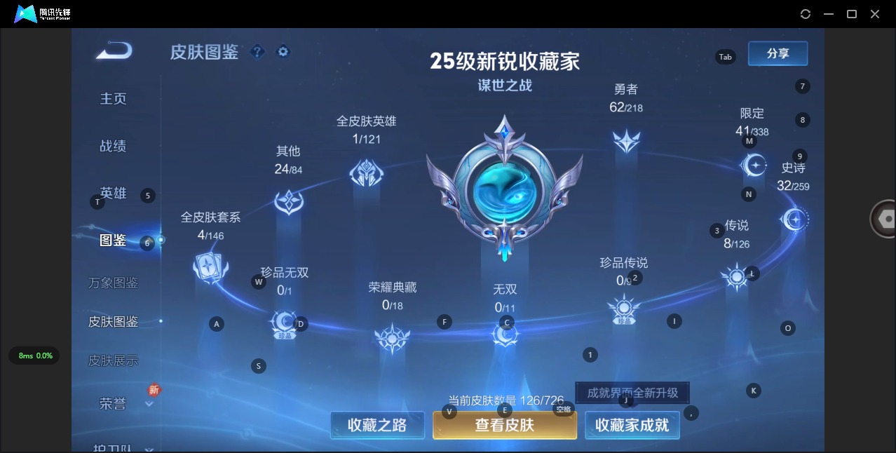 - PX_2082967-贵族等级: V8 英雄数: 124 皮肤数: 285 荣耀水晶: 天鹅之梦 星传说: 金色仲夏夜 传说皮: 云霓雀翎,末日机甲-孙尚香,仲夏夜之梦,音你心动-小乔,音你心动-周瑜,乞巧织情,超时空战士-狄仁杰,花朝如约,挚爱之约,挚爱花嫁,音你闪耀,山海·琳琅生,炽翼辉光 限定皮: 遇见飞天,游园惊梦,梁祝,白鹤梁神女,辉光之辰,白晶晶,天狼溯光者,天狼运算者,热情桑巴,纯白