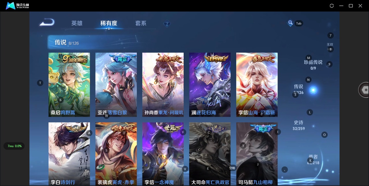 - PX_2070738-53 安卓QQ/至尊星耀/327皮肤/124英雄/1典藏/0珍品无双/1无双/3珍品传说/20传说/88史诗/9稀有英雄 【3 珍品传说】怪盗基德 马可波罗,时之奇旅 孙策,器灵·落星盏 嫦娥, 【1 典藏皮肤】弑枪猎影 韩信, 【1 无双皮肤】器灵·螭龙剑 曜, 【20 传说皮肤】胖达荣荣 梦奇,启明星使 虞姬,云霓雀翎 虞姬,无双飞将 马超,凤求凰 李白,时雨天司 诸葛亮