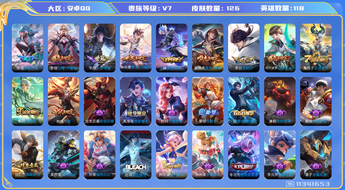 [11341653]V7 8传说 118英雄 126皮肤 可修改实名 优质装备:一念神魔,山海·炽霜斩(李信年限),澜逐花归海 传说皮:乘龙·问璇玑(孙尚香年限),落雪白狼 珍宝阁皮:妄想食味 限定皮:鸣野蒿,飞衡(韩信年限),诗剑行,五谷丰年,寅虎·赤拳(老虎年限),山海·玄木吟(马可年限) 史诗皮:石田雨龙,蔬乡物语(鲁班七号),紫霞仙子,江河有灵,匿光侦查者,末日机甲-莱西奥,百解令(蒙犽),高渐离燃音魔法,晚萤,猫狗日记-孙策,节奏热浪,摇滚巨星,水果甜心,天才门将,鬼剑武藏,舞动绿茵,地狱岩魂,拒霜思,逐浪之夏,曙光守护者,金属风暴,鹰眼统帅,魅力维加斯,无心