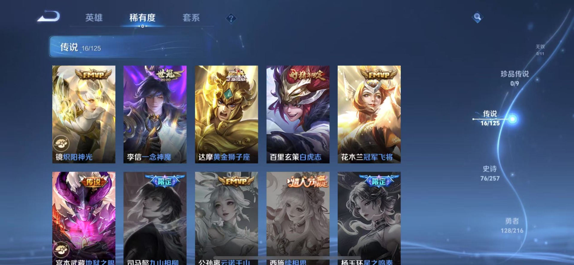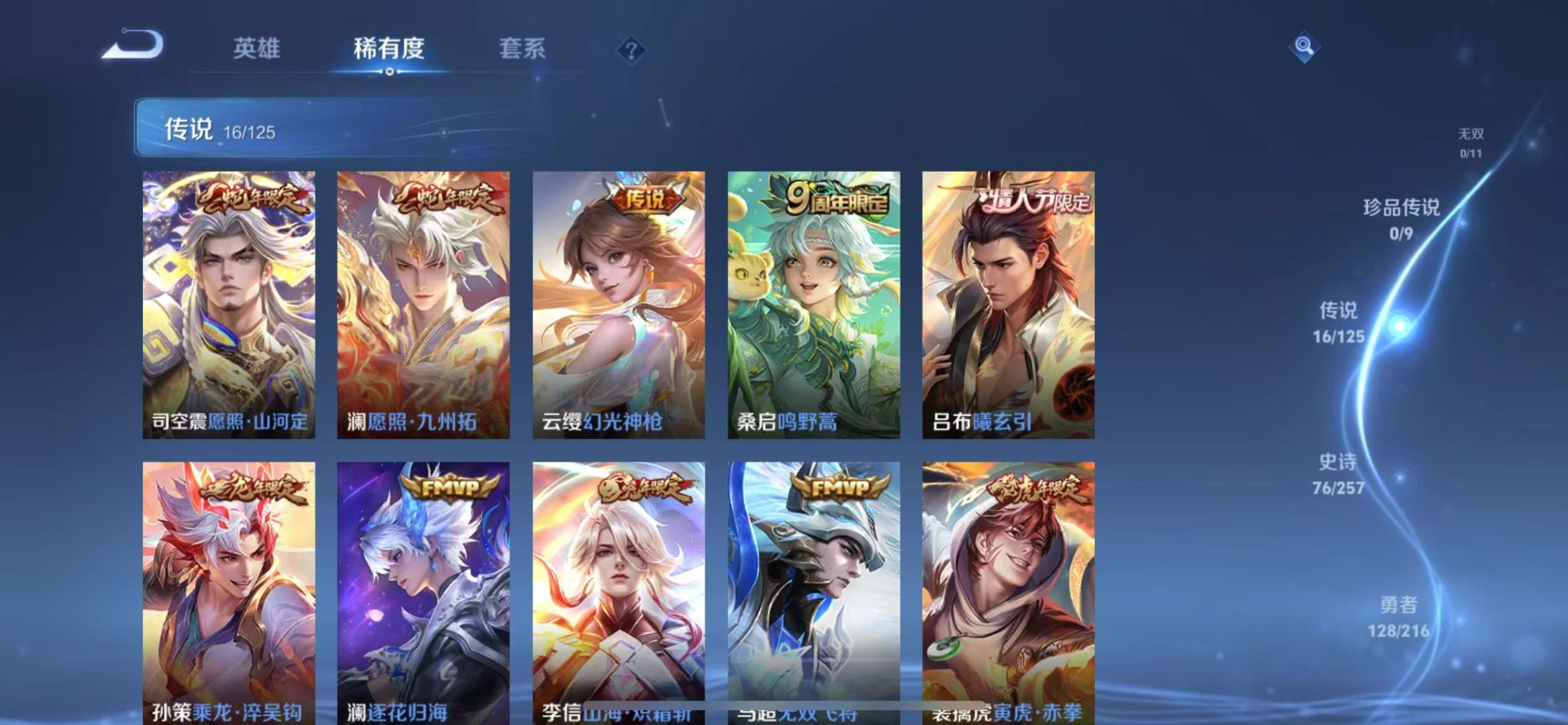 - PX_2093199-71 安卓QQ/至尊星耀/176皮肤/121英雄/0典藏/0珍品无双/0无双/0珍品传说/15传说/46史诗/7稀有英雄 【15 传说皮肤】启明星使 虞姬,云霓雀翎 虞姬,碎云 百里守约,云鹰飞将 曜,齐天大圣 孙悟空,诗剑行 李白,燃星之曲 花木兰,仲夏夜之梦 貂蝉,怒海麟威 吕布,时之恋人 刘备,末日机甲 孙尚香,末日机甲 孙策,淬星耀世 赵云,山海·苍雷引 曜,音你闪耀