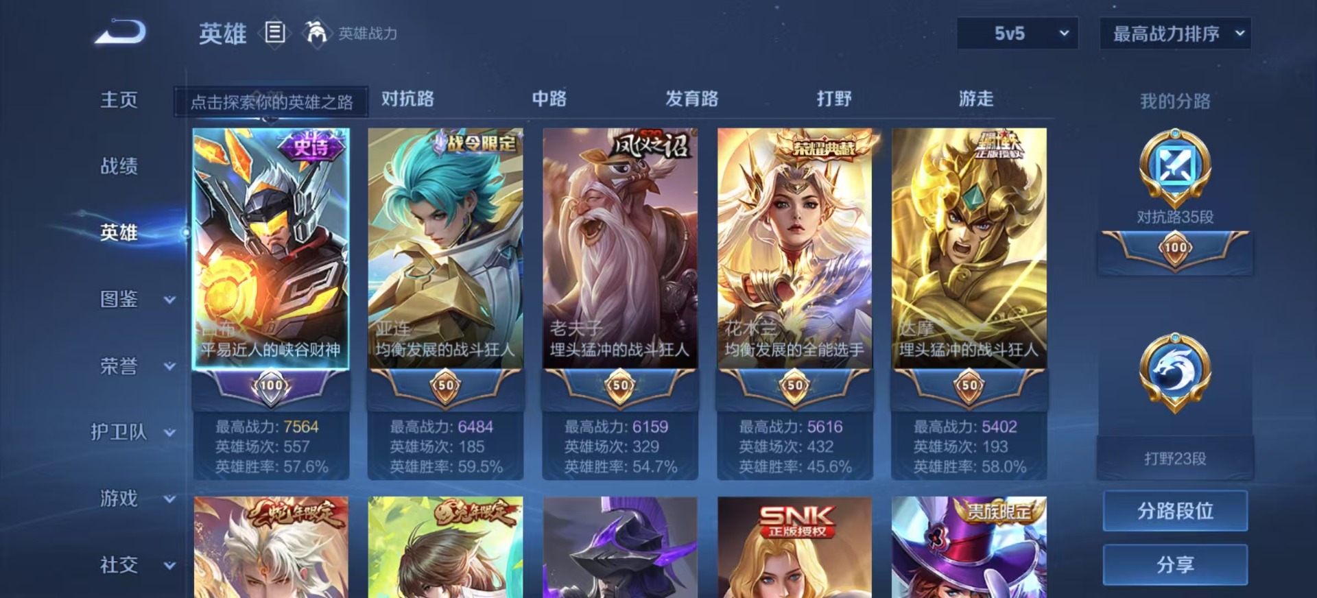 - PX_2113914-实名: 可修改 贵族等级: V7 英雄数: 123 皮肤数: 185 珍品传说: 黑崎一护 传说皮: 黄金狮子座,一念神魔,云霓雀翎,末日机甲-孙尚香,地狱火,超时空战士-狄仁杰,大乔-时之奇旅,祥瑞亨通 限定皮: 李小龙,孙行者,五谷丰年,山海·玄木吟,鸣野蒿,陌上桑,逐霄战戟,愿照·千秋盛,愿照·山河定,愿照·九州拓
