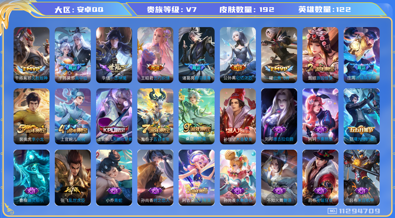 [11294709]V7 8传说 122英雄 192皮肤 可修改实名 优质装备:云鹰飞将(小将军),久胜战神,一念神魔,乞巧织情,画中仙,记忆之芯(机甲兔),鹤羽星尊 珍宝阁皮:优雅恋人 限定皮:鸣野蒿,五谷丰年,游园惊梦,梁祝,天狼绘梦者,李小龙,大圣娶亲,云端筑梦师 史诗皮:龙之律动,黄金分割率,江河有灵,蒙恬荣光圣徽,偶像歌手,魅语,青蛇,末日机甲-吕布,时之恋人-孙尚香,乱世虎臣,节奏热浪,女仆咖啡,摇滚巨星,水果甜心,星夜王子,心灵骇客,德古拉伯爵,幽灵船长,鬼剑武藏,繁星吟游(呼啦呼啦),曙光守护者,金属风暴,圣诞狂欢,鹰眼统帅,魅力维加斯,未来纪元-赵云