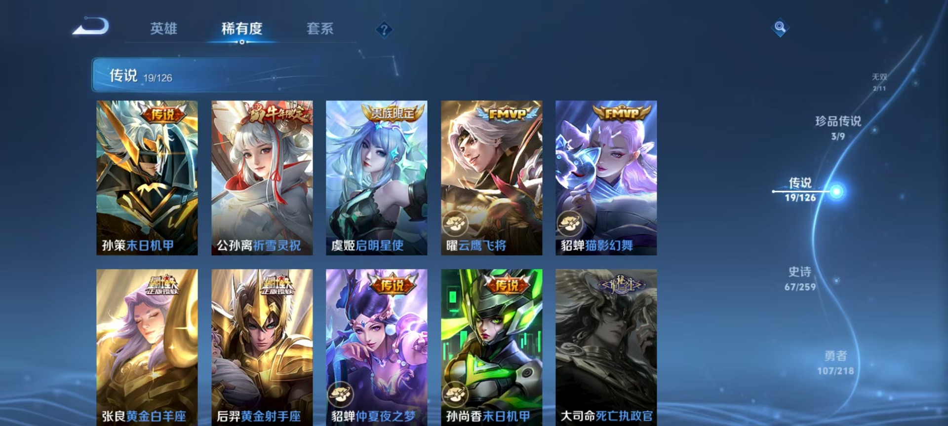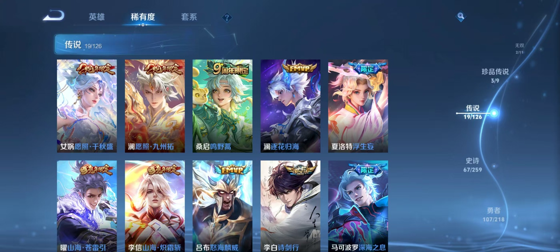 - [11657339]V9 4典藏 25传说 126英雄 366皮肤 典藏英雄武则天 可修改实名 优质装备:鸣剑·曳影,全息碎影(猴子典藏),九霄神辉(木兰典藏),弑枪猎影(韩信典藏),冠军飞将,云鹰飞将(小将军),久胜战神,一念神魔,地狱火,仲夏夜之梦(大飞蛾),海洋之心,音你心动-周瑜,淬星耀世,超时空战士-狄仁杰,音你闪耀(rap皮),碎云,山海·炽霜斩(李信年限),山海·苍雷引(电光曜子),画中仙,鹤归松栖(云缨) 珍宝阁皮:优雅恋人,蔷薇恋人,女武神 限定皮:鸣野蒿,至尊宝,凤求凰(白切鸡),太华(伽罗年限),武陵仙君(小桃花),时雨天司(水龙头),高山流水,诗剑行,怒海麟威,五谷丰年,青龙志(铠年限),梁祝,天狼溯光者,李小龙,朱雀志(守约年限),如梦令-后羿,孙行者,猪悟能,大圣娶亲,寅虎·御盾(廉颇年限),深海之息(深海大菠萝),冰霜神祇 史诗皮:鸭鸭历险记-刘禅,化蝶舞,灵蛊蚀心,星界战将,怒海争锋,百相守梦-黄忠,遇见神鹿,紫霞仙子,苍穹之光,电玩小子(小书包),白龙吟,黄金分割率,特工魅影,千年之狐,永昼,江河有灵,闲日渔趣,魅语,百解令(蒙犽),蒙恬荣光圣徽,冰冠公主,青蛇,偶像歌手,电玩·爆裂旋风,暗夜猫娘,龙骑士(小龙虾),末日机甲-吕布,猫狗日记-孙策,猫狗日记-大乔,时之恋人-孙尚香,乱世虎臣,节奏热浪,修罗,女仆咖啡,摇滚巨星,水果甜心,绅士熊喵,天才门将,星夜王子,心灵骇客,功夫厨神,德古拉伯爵,暗隐猎兽者,幽灵船长,鬼剑武藏,暗渊魔法,心灵战警,乐园奇幻夜,舞动绿茵,地狱岩魂,纤云弄巧,繁星吟游(呼啦呼啦),拒霜思,缤纷独角兽,乘风破浪,逐浪之夏,水晶猎龙者,曙光守护者,热力回旋,箭羽风息,金属风暴,原初追逐者,圣诞狂欢,圣诞恋歌,鹰眼统帅,暗夜贵公子,魅力维加斯,黎明之约,赏金猎手,寅虎·御盾,无心,未来纪元-赵云