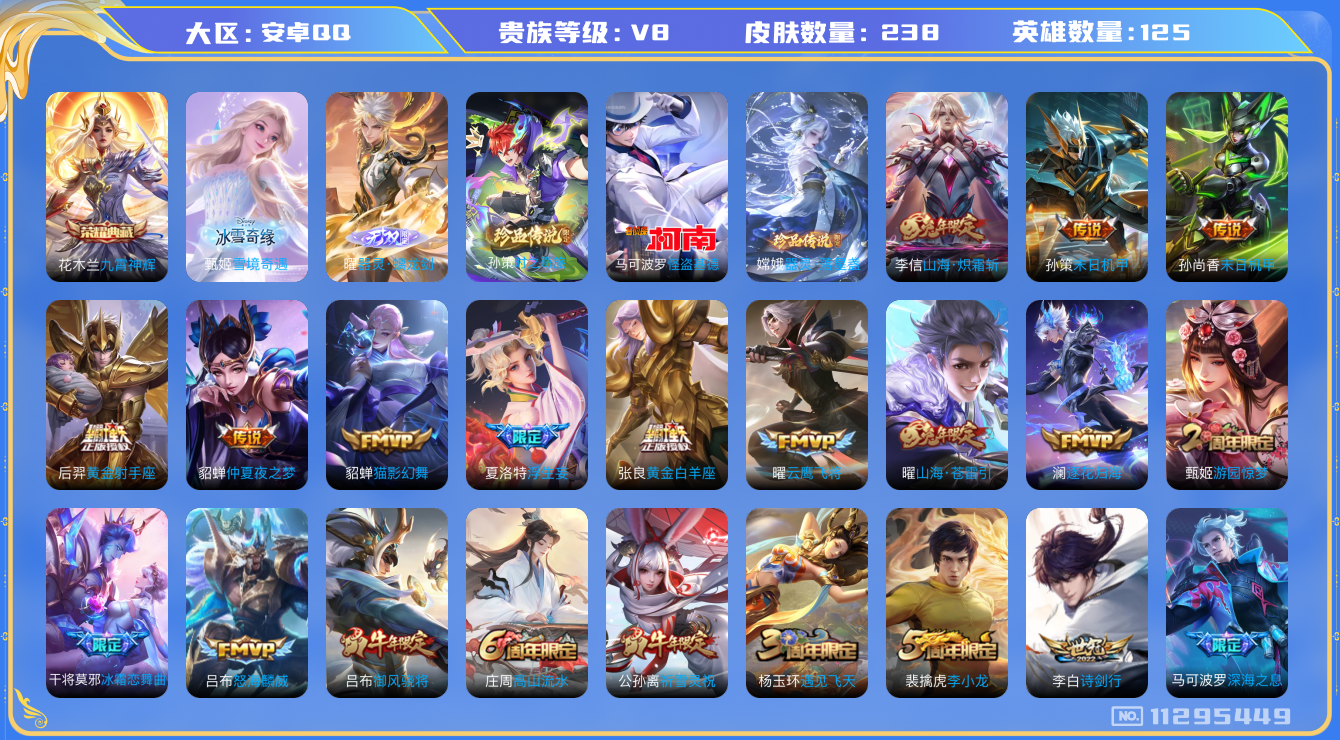 [11295449]V8 1典藏 2无双 3珍品传说 19传说 125英雄 238皮肤 可修改实名 女号 优质装备:九霄神辉(木兰典藏),雪境奇遇-甄姬,器灵·螭龙剑,怪盗基德,器灵·落星盏,黄金射手座,云鹰飞将(小将军),黄金白羊座,猫影幻舞,末日机甲-孙尚香(绿蚂蚱),仲夏夜之梦(大飞蛾),末日机甲-孙策,山海·炽霜斩(李信年限),山海·苍雷引(电光曜子),浮生妄,澜逐花归海 珍品传说:时之奇旅-孙策 珍宝阁皮:万物之道,蔷薇恋人 限定皮:愿照·九州拓(澜年限),愿照·千秋盛(女娲年限),鸣野蒿,神威(电光马子),遇见飞天,高山流水,诗剑行,怒海麟威,游园惊梦,御风骁将(吕布年限),祈雪灵祝(雪兔子),李小龙,猪悟能,冰霜恋舞曲,深海之息(深海大菠萝) 史诗皮:茶境仙,化蝶舞,龙之律动,雪豹·霜爪,石田雨龙,星界战将,百相守梦-百里守约,破空之剑,乘龙·聚宝船(安琪拉年限),琥珀纪元伽罗,紫霞仙子,电玩小子(小书包),黄金分割率,特工魅影,永昼,百解令(蒙犽),高渐离燃音魔法,暗夜猫娘,白蛇,魅语,偶像歌手,末日机甲-吕布,猫狗日记-大乔,节奏热浪,女仆咖啡,摇滚巨星,水果甜心,天才门将,星夜王子,心灵骇客,功夫厨神,德古拉伯爵,暗隐猎兽者,幽灵船长,鬼剑武藏,乐园奇幻夜,天秀·启明,舞动绿茵,纤云弄巧,拒霜思,缤纷独角兽,乘风破浪,逐浪之夏,水晶猎龙者,曙光守护者,金属风暴,原初追逐者,鹰眼统帅,王者之锤,未来纪元-赵云