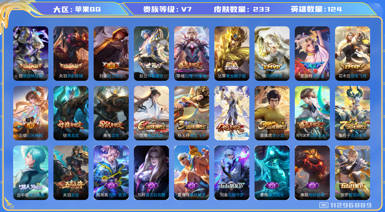 [11296889]V7 2典藏 10传说 124英雄 233皮肤 可修改实名 优质装备:赤影疾锋,银白咏叹调(倪克斯侍卫),黄金狮子座,冠军飞将,炽阳神光,时之恋人-刘备(电焊工),淬星耀世,山海·炽霜斩(李信年限),浮生妄 传说皮:幻光神枪 珍宝阁皮:妄想食味,女武神 限定皮:愿照·山河定(司空震年限),遇见飞天,高山流水,五谷丰年,青龙志(铠年限),武圣,岱宗(典韦年限),李小龙,时之祈愿-云中君,山海·玄木吟(马可年限) 史诗皮:茶境仙,器灵·浮梦炉,鸭鸭历险记-刘禅,龙之律动,电玩小子(小书包),百相守梦(刘备),真我赫兹(镜),江河有灵,蒙恬荣光圣徽,末日机甲-吕布,乱世虎臣,修罗,摇滚巨星,水果甜心,天才门将,星夜王子,功夫厨神,德古拉伯爵,幽灵船长,鬼剑武藏,心灵战警,乐园奇幻夜,地狱岩魂,乘风破浪,逐浪之夏,水晶猎龙者,箭羽风息,金属风暴,鹰眼统帅,魅力维加斯,黎明之约,赏金猎手,天秀·音浪,无心,未来纪元-赵云
