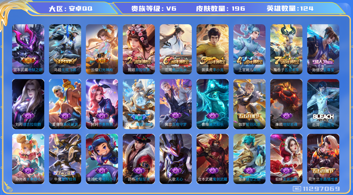 - PX_2081511-实名: 可修改 贵族等级: V7 英雄数: 123 皮肤数: 261 荣耀水晶: 幻阙歌 珍品传说: 黑崎一护 传说皮: 黄金狮子座,末日机甲-孙尚香,地狱之眼,超时空战士-狄仁杰,霜月吟 限定皮: 李小龙,游园惊梦,梁祝,时雨天司,引擎之心,神威,青春决赛季,逐梦之影,凤求凰,至尊宝,五谷丰年,愿照·山河定