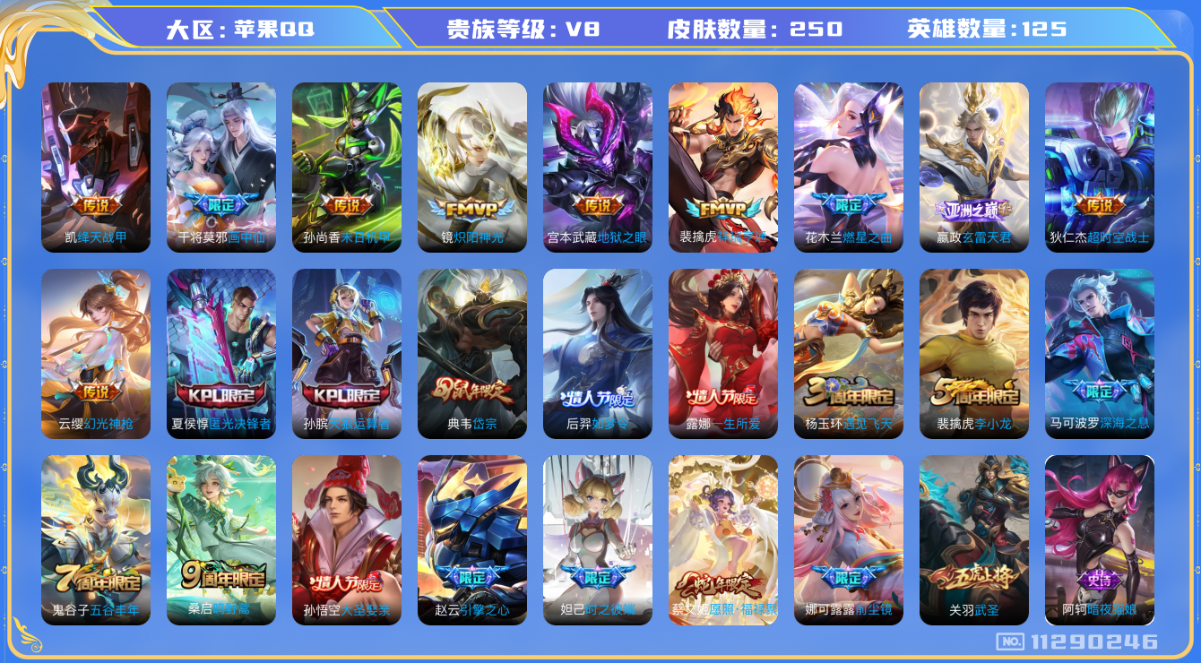 [11290246]V8 16传说 125英雄 250皮肤 可修改实名 优质装备:绛天战甲(鸡嘴战神),炽阳神光,末日机甲-孙尚香(绿蚂蚱),地狱之眼,超时空战士-狄仁杰,燃星之曲,画中仙,玄雷天君 传说皮:祥瑞亨通,幻光神枪 珍宝阁皮:优雅恋人 限定皮:愿照·福禄聚(蔡文姬年限),鸣野蒿,前尘镜,时之彼端,遇见飞天,匿光决锋者,五谷丰年,武圣,天狼运算者,岱宗(典韦年限),李小龙,如梦令-后羿,一生所爱,大圣娶亲,引擎之心,深海之息(深海大菠萝) 史诗皮:苍鳞隐世,器灵·浮梦炉,狼魂孤将,紫霞仙子,白龙吟,黄金分割率,特工魅影,千年之狐,暗夜猫娘,无限星赏官,末日机甲-吕布,猫狗日记-孙策,时之恋人-孙尚香,乱世虎臣,节奏热浪,修罗,女仆咖啡,水果甜心,绅士熊喵,天才门将,星夜王子,功夫厨神,暗隐猎兽者,心灵战警,地狱岩魂,纤云弄巧,繁星吟游(呼啦呼啦),缤纷独角兽,逐浪之夏,水晶猎龙者,箭羽风息,圣诞狂欢,圣诞恋歌,鹰眼统帅,无心,未来纪元-赵云