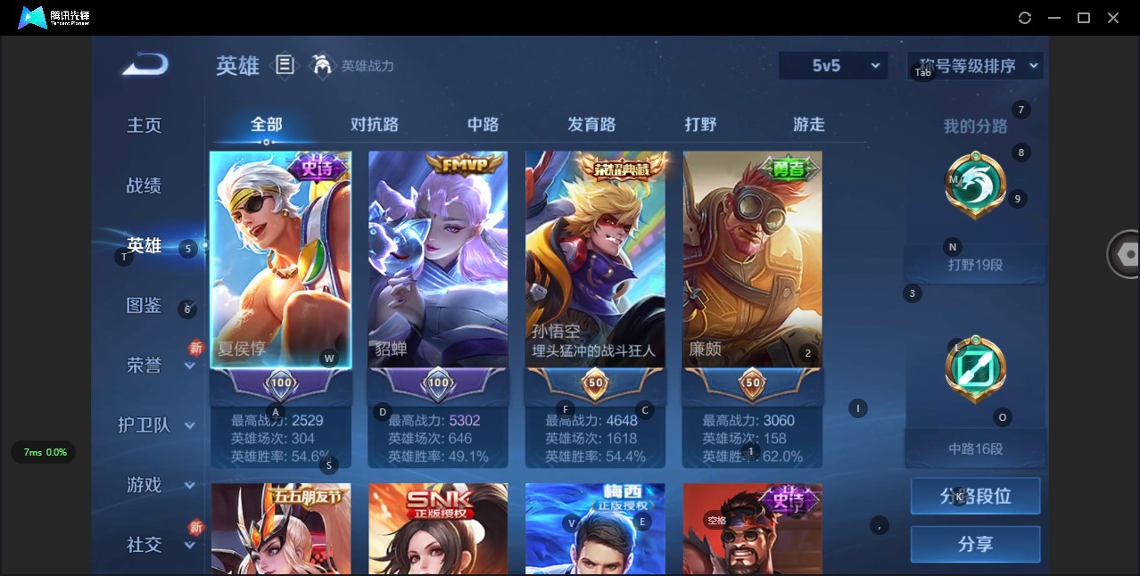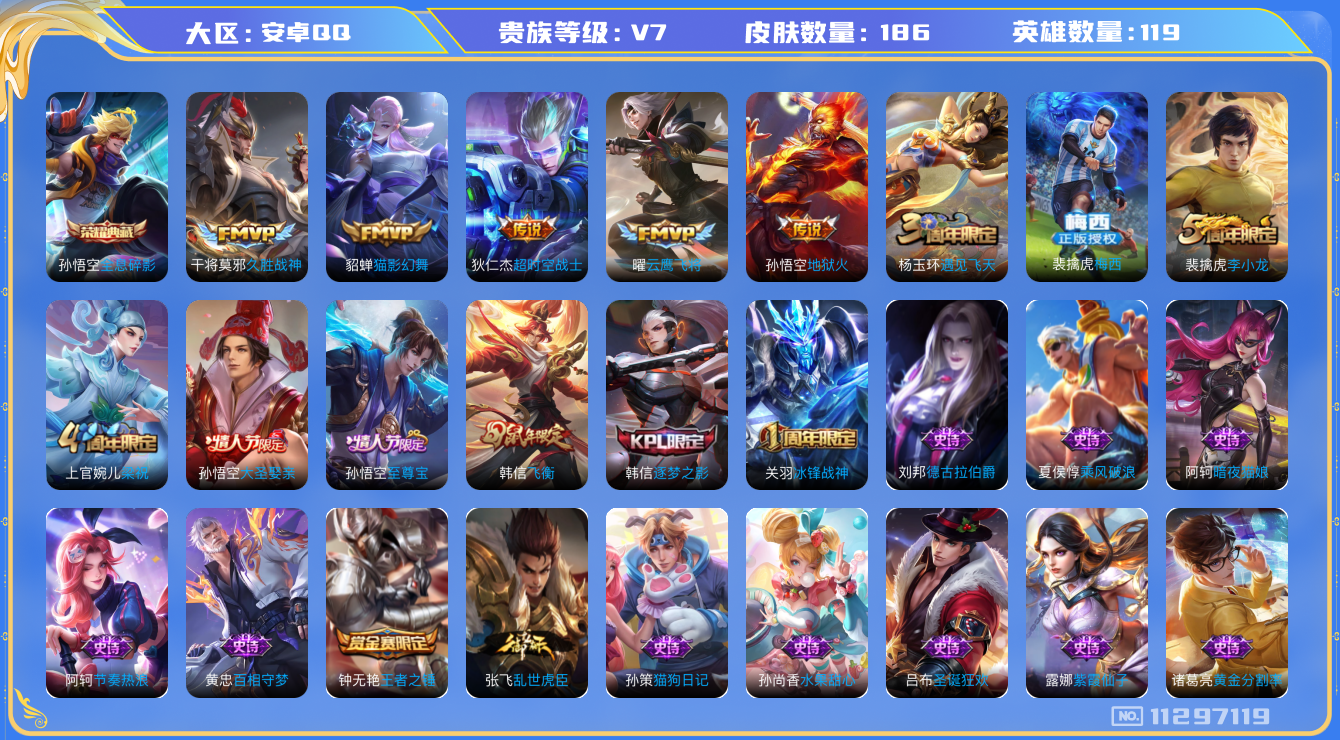 [11297119]V7 1典藏 5传说 119英雄 186皮肤 可修改实名 荣耀水晶:全息碎影(猴子典藏) 传说皮:地狱火,久胜战神,猫影幻舞,云鹰飞将(小将军),超时空战士-狄仁杰 珍宝阁皮:万物之道 限定皮:至尊宝,梅西,飞衡(韩信年限),遇见飞天,冰锋战神,梁祝,李小龙,逐梦之影,大圣娶亲 史诗皮:百相守梦-黄忠,紫霞仙子,黄金分割率,千年之狐,冰冠公主,偶像歌手,无限星赏官,暗夜猫娘,猫狗日记-孙策,乱世虎臣,节奏热浪,水果甜心,星夜王子,功夫厨神,德古拉伯爵,舞动绿茵,乘风破浪,逐浪之夏,水晶猎龙者,原初追逐者,圣诞狂欢,圣诞恋歌,鹰眼统帅,王者之锤,魅力维加斯,黎明之约,未来纪元-赵云