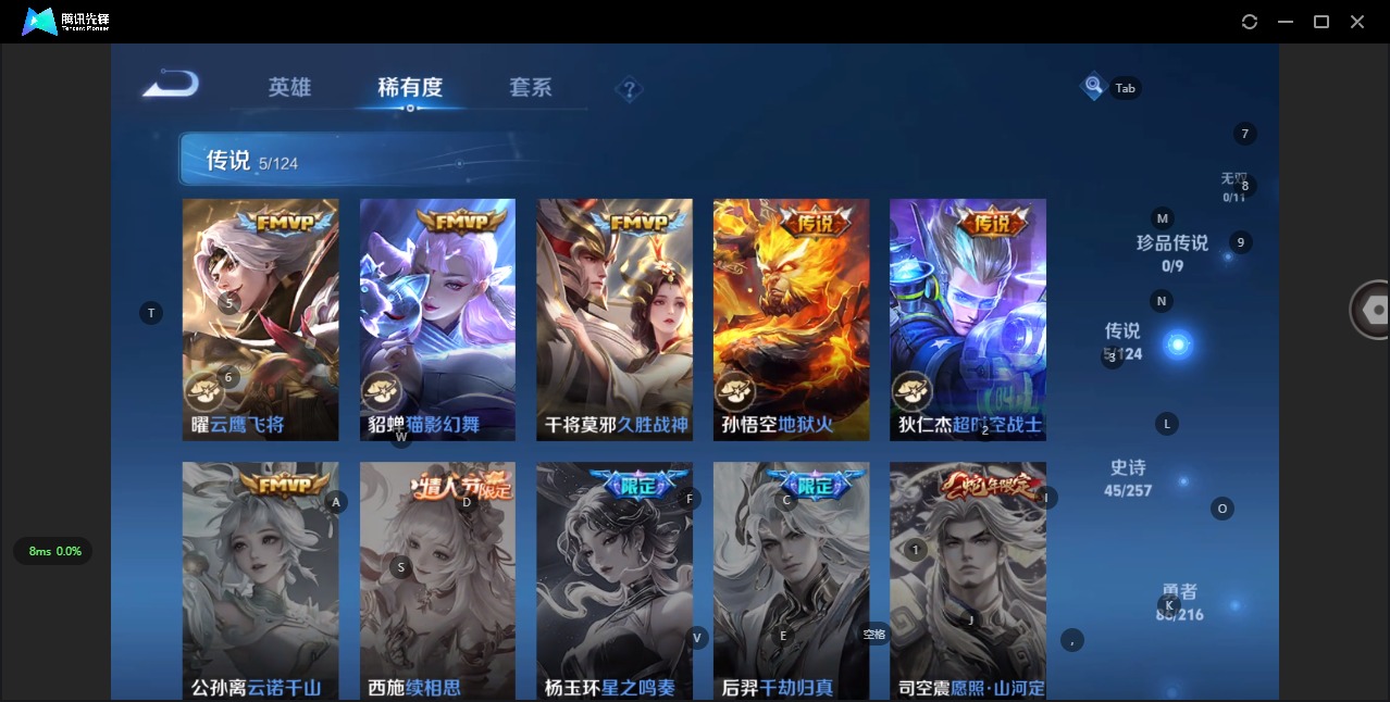 - PX_2060137-30 安卓QQ/最强王者/293皮肤/124英雄/1典藏/0珍品无双/0无双/1珍品传说/21传说/87史诗/9稀有英雄 【1 珍品传说】器灵·落星盏 嫦娥, 【1 典藏皮肤】鸣剑·曳影 李白, 【21 传说皮肤】启明星使 虞姬,碎云 百里守约,逐花归海 澜,无双飞将 马超,零号·赤焰 孙悟空,云鹰飞将 曜,深海之息 马可波罗,游龙清影 西施,炽阳神光 镜,怒海麟威 吕布,山
