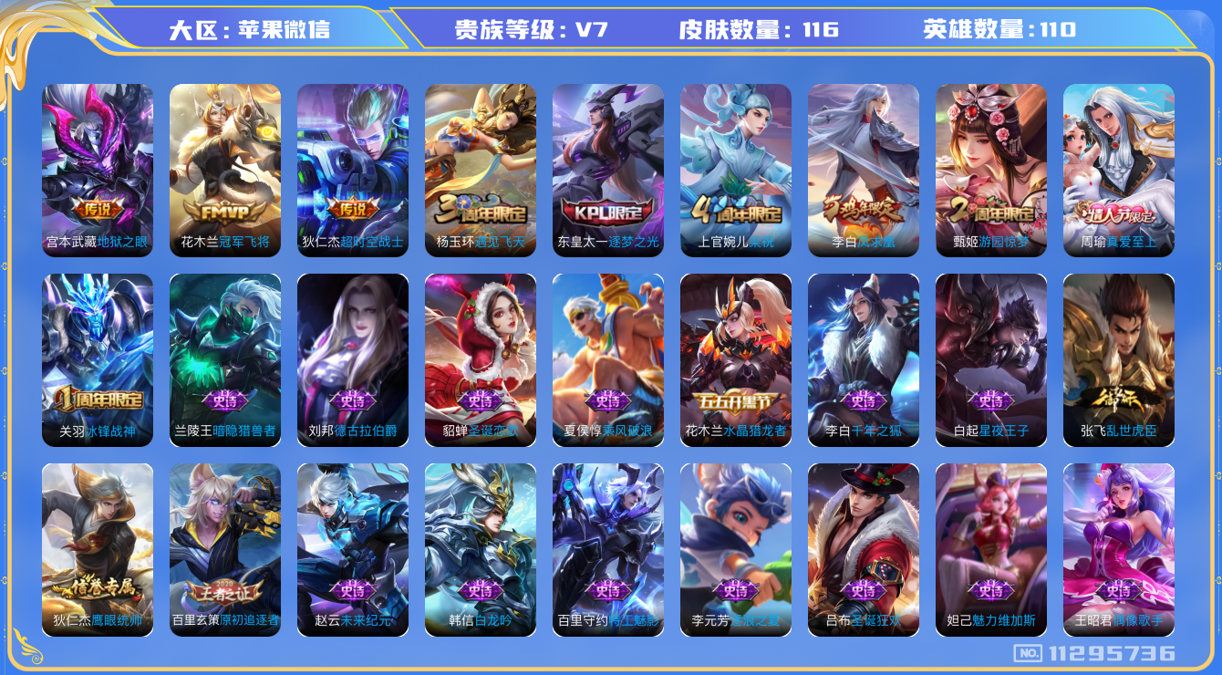 - [11864080]V7 1典藏 1无双 5传说 125英雄 251皮肤 可修改实名 优质装备:幻阙歌(貂蝉典藏),韩信群星魔术团(韩信无双),黄金射手座,无双飞将 珍宝阁皮:妄想食味,优雅恋人,蔷薇恋人 限定皮:鸣野蒿,至尊宝,神威(电光马子),飞衡(韩信年限),高山流水,诗剑行,齐天大圣,五谷丰年,青龙志(铠年限),梁祝,李小龙,逐梦之影 史诗皮:灵蛊蚀心,星界战将,埋骨钱,百相守梦-百里守约,百相守梦-黄忠,电玩小子(小书包),白龙吟,特工魅影,江河有灵,百解令(蒙犽),高渐离燃音魔法,蒙恬荣光圣徽,电玩·爆裂旋风,猫狗日记-孙策,乱世虎臣,摇滚巨星,水果甜心,绅士熊喵,天才门将,暗隐猎兽者,鬼剑武藏,舞动绿茵,地狱岩魂,繁星吟游(呼啦呼啦),拒霜思,缤纷独角兽,乘风破浪,逐浪之夏,箭羽风息,金属风暴,圣诞狂欢,圣诞恋歌,鹰眼统帅,魅力维加斯,黎明之约,无心,未来纪元-赵云