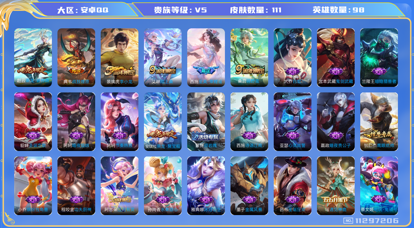 [11297206]V5 3传说 98英雄 111皮肤 可修改实名 传说皮:乘龙·铭钟鼎(赵云年限),典韦战鼓燎原 珍宝阁皮:女武神 限定皮:陌上桑,鸣野蒿,至美·乘鲤谣,李小龙 史诗皮:蒙犽顽岩魄,乘龙·聚宝船(安琪拉年限),遇见神鹿,电玩·兔顽号,江河有灵,白蛇,暗夜猫娘,冰冠公主,节奏热浪,水果甜心,绅士熊喵,功夫厨神,暗隐猎兽者,鬼剑武藏,心灵战警,诗语江南,缤纷独角兽,金属风暴,圣诞狂欢,圣诞恋歌,鹰眼统帅,暗夜贵公子,魅力维加斯