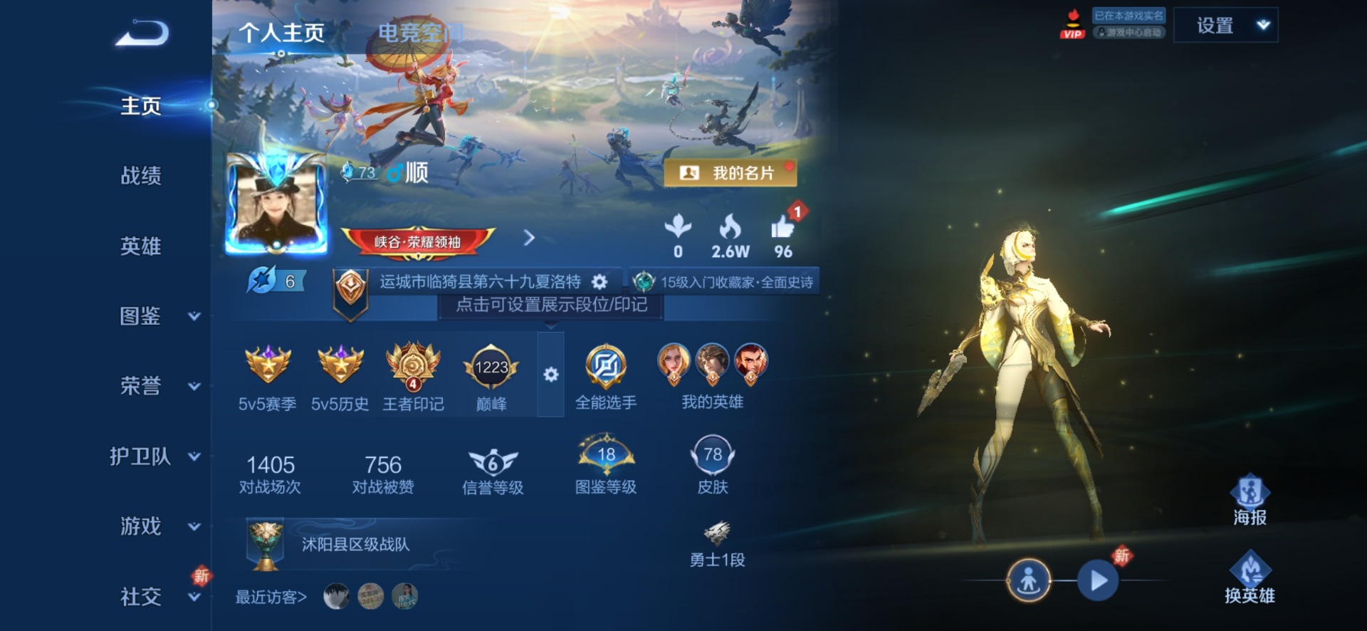 [11297906]V3 2传说 120英雄 78皮肤 可修改实名 优质装备:炽阳神光 珍宝阁皮:万物之道 限定皮:鸣野蒿,李小龙 史诗皮:百相守梦-黄忠,千年之狐,高渐离燃音魔法,乱世虎臣,节奏热浪,摇滚巨星,水果甜心,星夜王子,暗隐猎兽者,鬼剑武藏,圣诞狂欢,鹰眼统帅,魅力维加斯,未来纪元-赵云