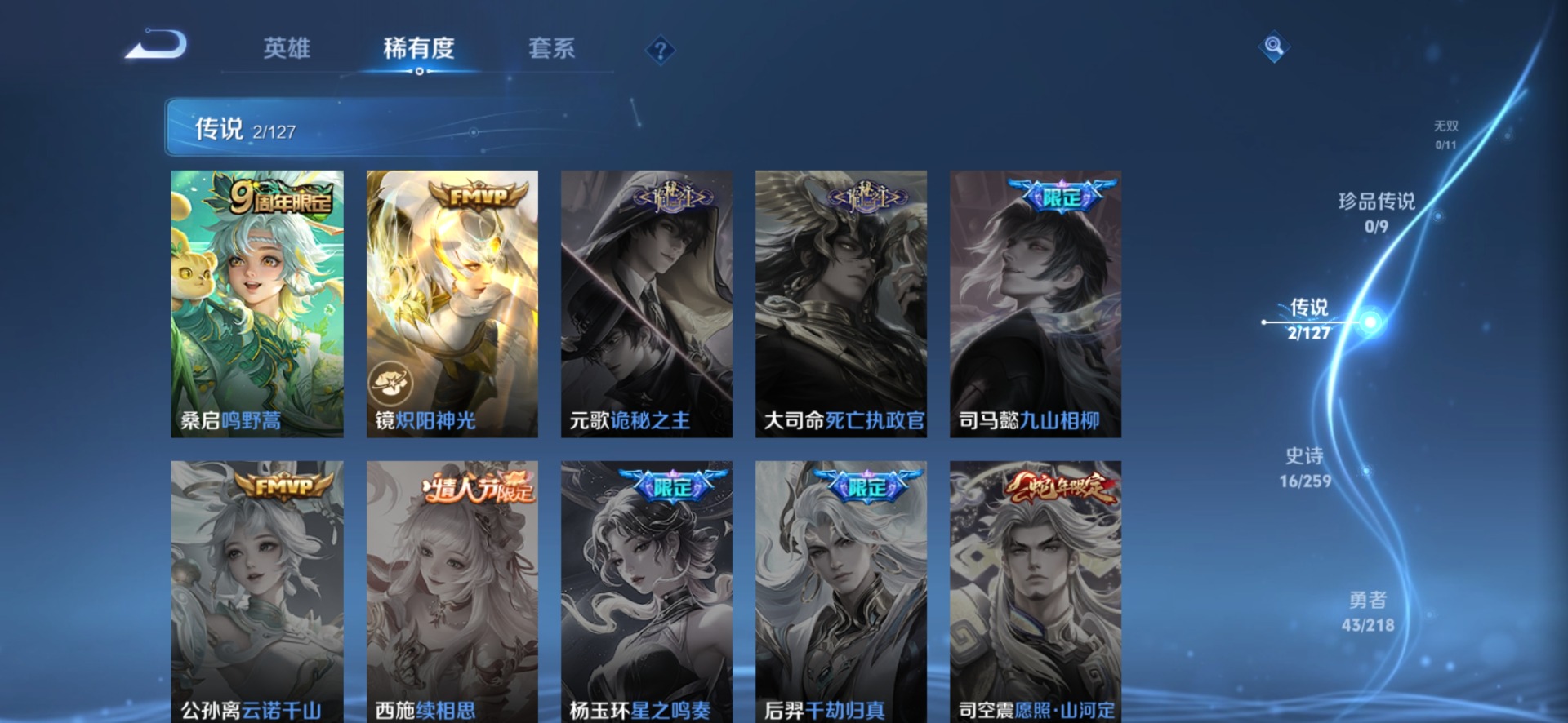 - PX_2089914-实名: 可修改 贵族等级: V5 英雄数: 122 皮肤数: 123 传说皮: 炽阳神光,无双飞将,澜逐花归海 限定皮: 李小龙,五谷丰年,鸣野蒿,愿照·九州拓