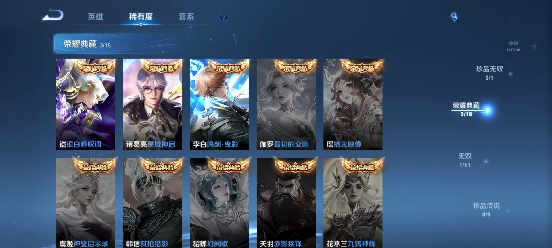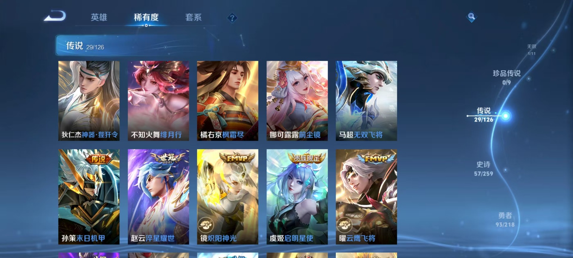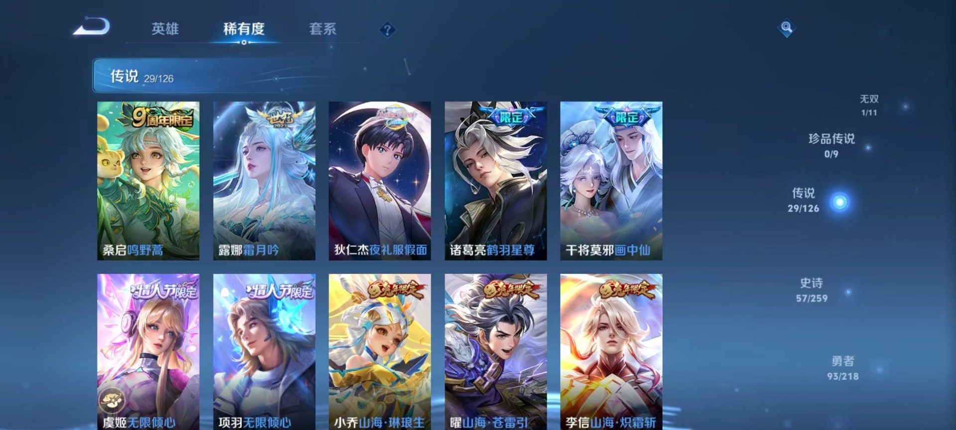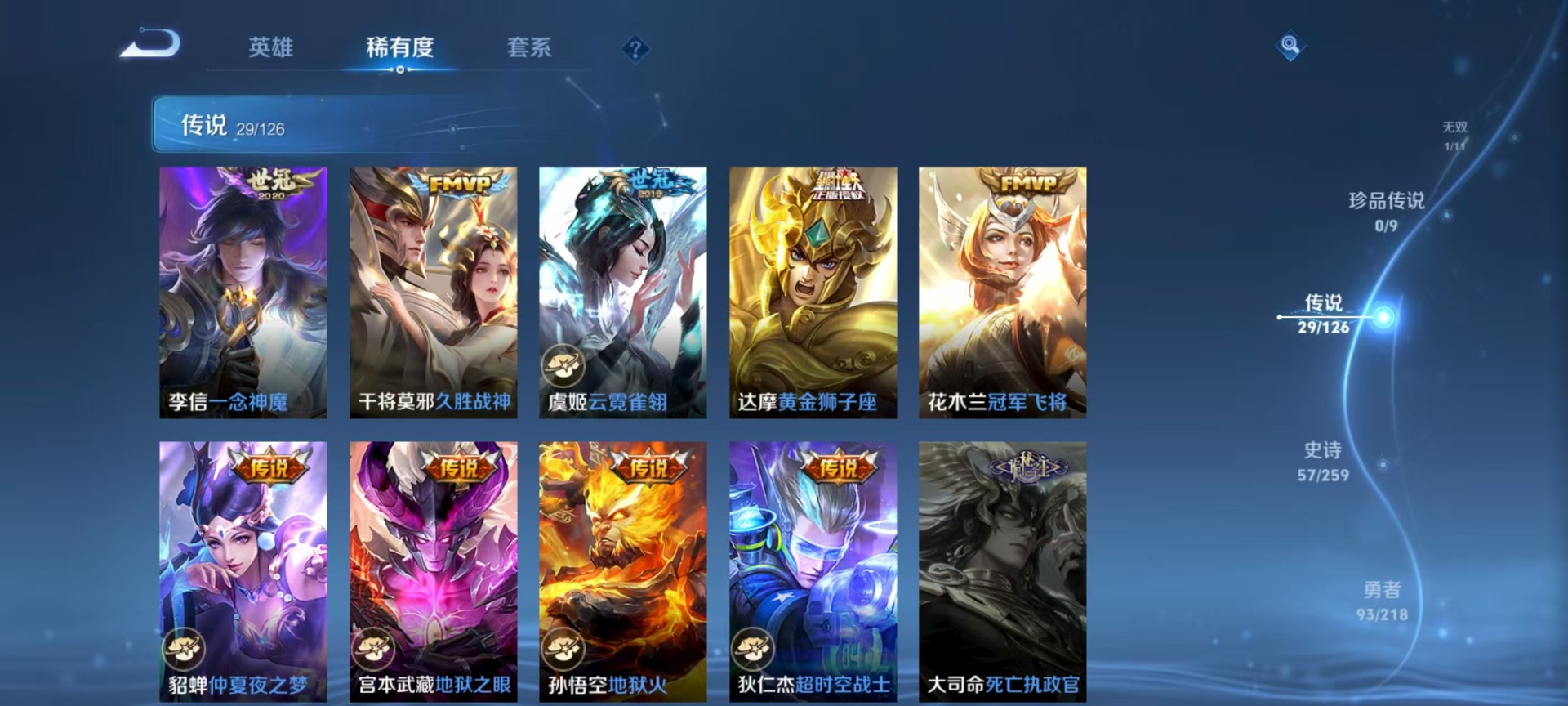 - PX_2089900-27 安卓QQ/至尊星耀/215皮肤/123英雄/0典藏/0珍品无双/0无双/1珍品传说/9传说/40史诗/8稀有英雄 【1 珍品传说】怪盗基德 马可波罗, 【9 传说皮肤】诗剑行 李白,异界灵契 孙尚香,炽翼辉光 伽罗,超时空战士 狄仁杰,山海·苍雷引 曜,愿照·九州拓 澜,牧神诗旅 庄周,鸣野蒿 桑启,云诺千山 公孙离, 【40 史诗皮肤】银河之约 李元芳,暗渊魔法 司马