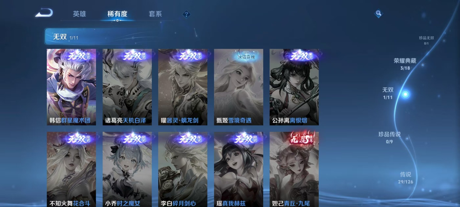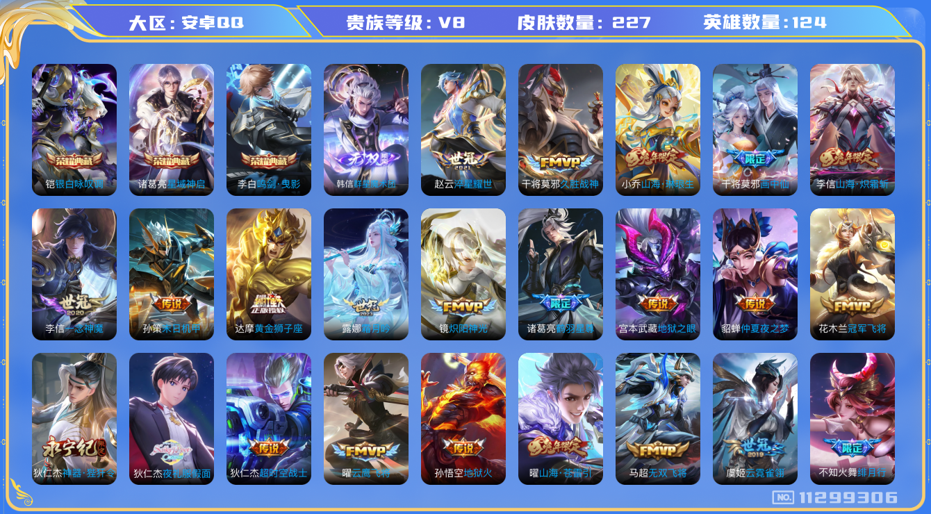 [11299306]V8 3典藏 1无双 29传说 124英雄 227皮肤 可修改实名 优质装备:鸣剑·曳影,星域神启(倪克斯贼亮),银白咏叹调(倪克斯侍卫),韩信群星魔术团(韩信无双),黄金狮子座,冠军飞将,云鹰飞将(小将军),久胜战神,炽阳神光,一念神魔,云霓雀翎,地狱火,仲夏夜之梦(大飞蛾),地狱之眼,淬星耀世,超时空战士-狄仁杰,末日机甲-孙策,无双飞将,神器·狴犴令,山海·炽霜斩(李信年限),山海·琳琅生(小乔年限),山海·苍雷引(电光曜子),画中仙,鹤羽星尊,夜礼服假面,霜月吟 珍宝阁皮:胡桃夹子,蔷薇恋人 限定皮:鸣野蒿,前尘镜,绯月行,神威(电光马子),飞衡(韩信年限),山海·碧波行(瑶年限),无限倾心-项羽,无限倾心-虞姬,五谷丰年,梁祝,李小龙,辉光之辰,枫霜尽,山海·玄木吟(马可年限) 史诗皮:鸭鸭历险记-刘禅,龙之律动,百相守梦-周瑜,茶境仙,百相守梦-黄忠,遇见神鹿,紫霞仙子,黄金分割率,特工魅影,千年之狐,鹤归松栖(赵怀真),蒙恬荣光圣徽,偶像歌手,龙骑士(小龙虾),魅语,晚萤,末日机甲-吕布,猫狗日记-大乔,节奏热浪,女仆咖啡,摇滚巨星,水果甜心,天才门将,星夜王子,心灵骇客,德古拉伯爵,幽灵船长,鬼剑武藏,暗渊魔法,天秀·启明,诗语江南,缤纷独角兽,水晶猎龙者,曙光守护者,热力回旋,金属风暴,圣诞恋歌,鹰眼统帅,魅力维加斯,赏金猎手,无心,未来纪元-赵云