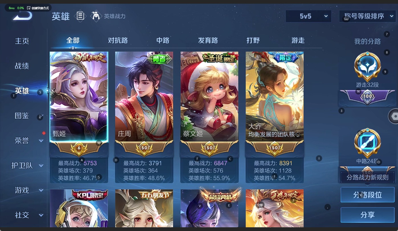 - PX_2088938- 可二次 V8 贵族积分50072 安卓QQ/124皮肤/119英雄/1典藏/0珍品无双/0无双/0珍品传说/9传说/26史诗/7稀有英雄 【1 典藏皮肤】,全息碎影 孙悟空, 【9 传说皮肤】,启明星使 虞姬,云霓雀翎 虞姬,白虎志 百里玄策,凤求凰 李白,仲夏夜之梦 貂蝉,地狱之眼 宫本武藏,黄金狮子座 达摩,末日机甲 孙尚香,冠军飞将 花木兰, 【26 史诗皮肤】,电玩