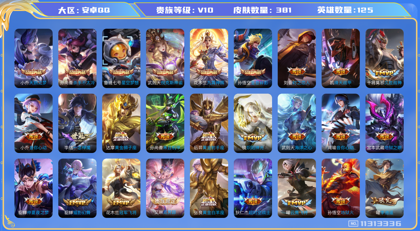 [11313336]V10 6典藏 35传说 125英雄 381皮肤 典藏英雄武则天 可修改实名 优质装备:天鹅之梦(小乔典藏),星空梦想(太空人),倪克斯神谕(宇宙婆娘),杀手不太冷,全息碎影(猴子典藏),九霄神辉(木兰典藏),黄金狮子座,黄金射手座,冠军飞将,云鹰飞将(小将军),绛天战甲(鸡嘴战神),黄金白羊座,猫影幻舞,久胜战神,炽阳神光,一念神魔,云霓雀翎,末日机甲-孙尚香(绿蚂蚱),地狱火,仲夏夜之梦(大飞蛾),音你心动-小乔,海洋之心,地狱之眼,飞鸢探春,音你心动-周瑜,胖达荣荣,李逍遥,时之恋人-刘备(电焊工),超时空战士-狄仁杰,艾琳觅芳踪 传说皮:幻光神枪 珍宝阁皮:女武神,玩趣恶龙 限定皮:愿照·山河定(司空震年限),白虎志(电光耗子),凤求凰(白切鸡),凤凰于飞,梅西,武陵仙君(小桃花),白鹤梁神女,魔法小厨娘,白晶晶,时雨天司(水龙头),瑞麟志(木兰年限),至美·乘鲤谣,遇见飞天,青龙志(铠年限),冰锋战神,幽恒(沐浴露),天狼运算者,游园惊梦,梁祝,御风骁将(吕布年限),逐梦之翼,逐梦之星,天狼溯光者,逐梦之音,奔雷神使(牛魔年限),祈雪灵祝(雪兔子),天狼绘梦者,李小龙,逐梦之影,逐梦之光,玄武志(苏烈年限),朱雀志(守约年限),永曜之星,辉光之辰,如梦令-嫦娥,如梦令-后羿,霸王别姬-项羽,霸王别姬-虞姬,奇迹圣诞,默契交锋-兰陵王,默契交锋-花木兰,真爱至上,纯白花嫁,一生所爱,大圣娶亲,引擎之心,天魔缭乱,青春决赛季,冰霜恋舞曲,云端筑梦师,蜜橘之夏,热情桑巴,美猴王 史诗皮:苍鳞隐世,器灵·浮梦炉,龙之律动,石田雨龙,幻珠鲛人,百相守梦-百里守约,遇见神鹿,紫霞仙子,苍穹之光,电玩小子(小书包),白龙吟,黄金分割率,特工魅影,千年之狐,偶像歌手,龙骑士(小龙虾),白蛇,暗夜猫娘,魅语,无限星赏官,晚萤,冰冠公主,青蛇,末日机甲-吕布,猫狗日记-孙策,猫狗日记-大乔,时之恋人-孙尚香,乱世虎臣,节奏热浪,修罗,女仆咖啡,摇滚巨星,水果甜心,绅士熊喵,天才门将,星夜王子,心灵骇客,功夫厨神,德古拉伯爵,暗隐猎兽者,幽灵船长,鬼剑武藏,心灵战警,天秀·启明,舞动绿茵,地狱岩魂,诗语江南,纤云弄巧,繁星吟游(呼啦呼啦),缤纷独角兽,乘风破浪,逐浪之夏,龙鼓争鸣,水晶猎龙者,曙光守护者,热力回旋,箭羽风息,金属风暴,原初追逐者,圣诞狂欢,圣诞恋歌,鹰眼统帅,