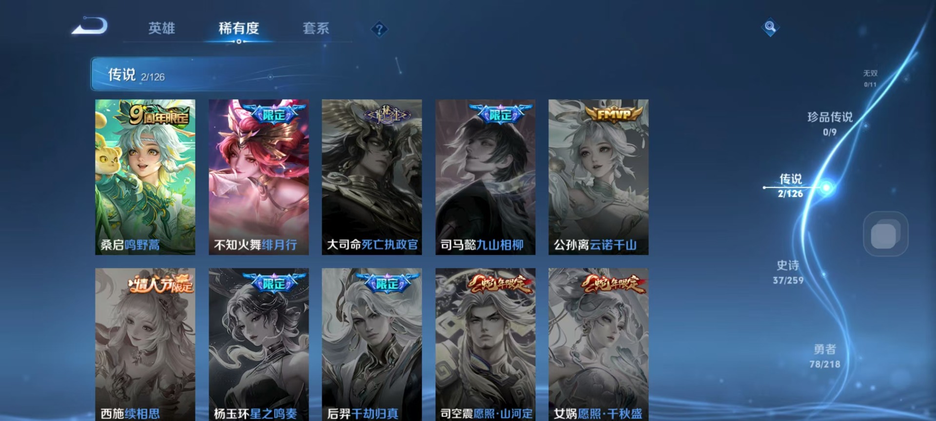 - PX_2093200-72 安卓QQ/荣耀王者/303皮肤/123英雄/1典藏/0珍品无双/0无双/2珍品传说/19传说/92史诗/8稀有英雄 【2 珍品传说】时之奇旅 孙策,器灵·落星盏 嫦娥, 【1 典藏皮肤】九霄神辉 花木兰, 【19 传说皮肤】启明星使 虞姬,无双飞将 马超,猫影幻舞 貂蝉,炽阳神光 镜,霜月吟 露娜,时之恋人 刘备,黄金狮子座 达摩,末日机甲 孙尚香,乘龙·淬吴钩 孙策,