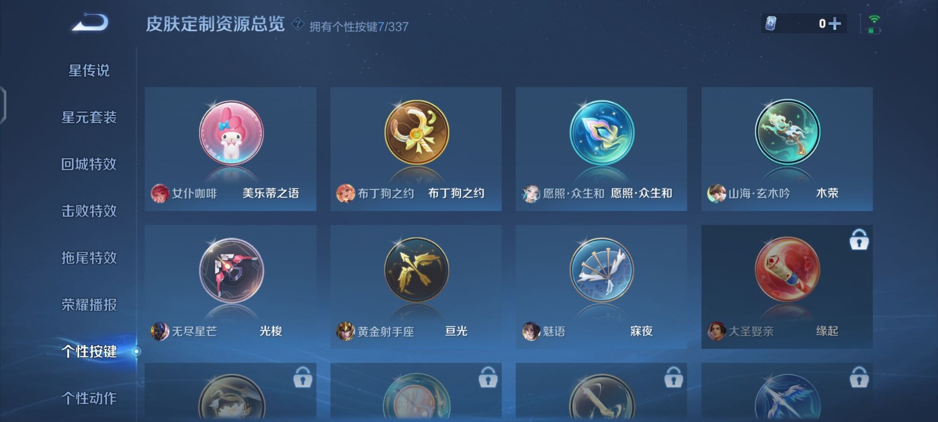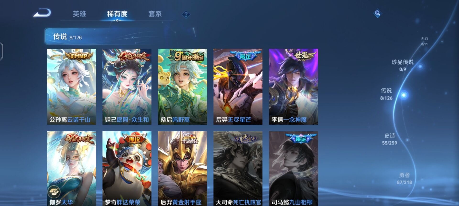 伽罗天狼溯光者,伽罗太华,后羿无尽星芒,后羿如梦令,公孙离玉兔公主,裴擒虎李小龙,马可波罗山海·玄木吟,桑启鸣野蒿,孙悟空孙行者,妲己愿照·众生和