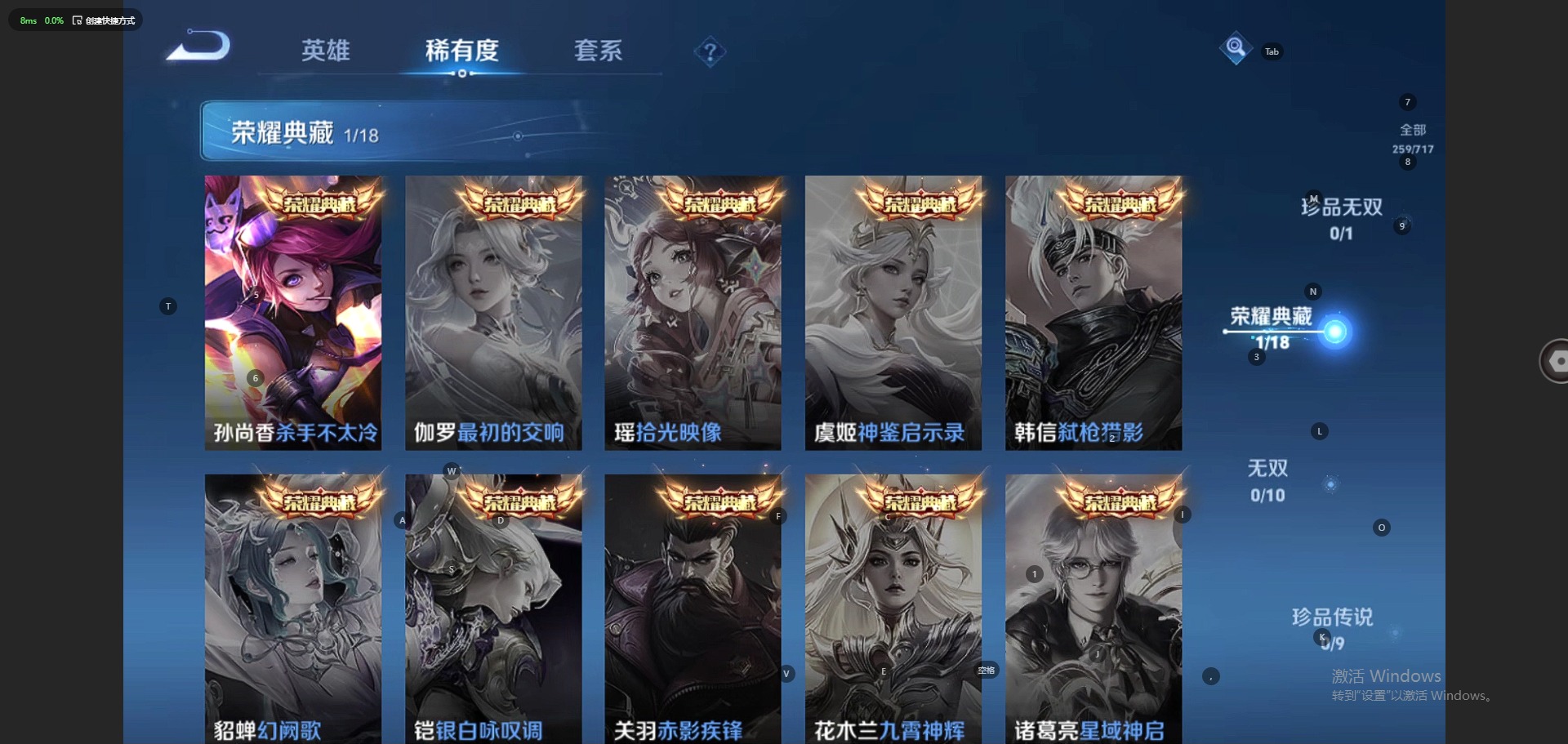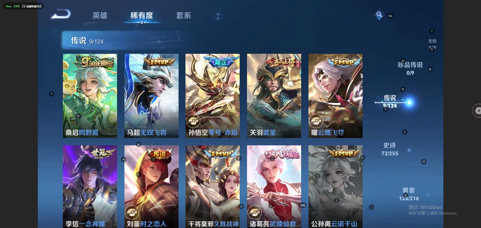 [11296432]V8 1典藏 9传说 125英雄 259皮肤 可修改实名 安全保护中 荣耀水晶:杀手不太冷 传说皮:零号·赤焰,一念神魔,久胜战神,云鹰飞将(小将军),无双飞将,时之恋人-刘备(电焊工) 珍宝阁皮:蔷薇恋人,玩趣恶龙 限定皮:鸣野蒿,武陵仙君(小桃花),傲雪梅枪,高山流水,五谷丰年,武圣,李小龙,孙行者,猪悟能,百木心枪,山海·玄木吟(马可年限) 史诗皮:百相守梦-百里守约,星界战将,化蝶舞,鸭鸭历险记-刘禅,龙之律动,石田雨龙,百相守梦-周瑜,电玩小子(小书包),黄金分割率,特工魅影,千年之狐,电玩·爆裂旋风,冰冠公主,江河有灵,百解令(蒙犽),高渐离燃音魔法,蒙恬荣光圣徽,偶像歌手,青蛇,暗夜猫娘,魅语,末日机甲-吕布,猫狗日记-孙策,节奏热浪,修罗,水果甜心,绅士熊喵,天才门将,星夜王子,心灵骇客,暗隐猎兽者,幽灵船长,鬼剑武藏,舞动绿茵,地狱岩魂,拒霜思,缤纷独角兽,乘风破浪,逐浪之夏,水晶猎龙者,金属风暴,原初追逐者,圣诞狂欢,圣诞恋歌,鹰眼统帅,暗夜贵公子,魅力维加斯,黎明之约,赏金猎手