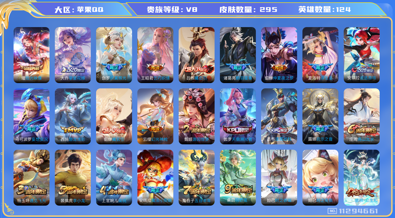 [11294661]V8 1典藏 20传说 124英雄 295皮肤 可修改实名 优质装备:拾光映像(瑶典藏),仲夏夜之梦(大飞蛾),乞巧织情,游龙清影(小青龙),挚爱花嫁,炽翼辉光(娃娃菜牛角包),浮生妄,追逃游戏(安琪拉),鹤羽星尊,妄想实况 传说皮:貂蝉曦玄引,吕布曦玄引,幻光神枪 珍宝阁皮:万物之道,蔷薇恋人,玩趣恶龙 限定皮:愿照·福禄聚(蔡文姬年限),愿照·众生和(妲己年限),逐霄战戟,映山客,鸣野蒿,时之彼端,魔法小厨娘,遇见飞天,高山流水,无限倾心-虞姬,五谷丰年,游园惊梦,梁祝,天狼溯光者,李小龙,时之祈愿-瑶(瑶传限),启示之音,时之奇旅-妲己 史诗皮:器灵·浮梦炉,化蝶舞,星界战将,石田雨龙,茶境仙,芈月浮光幕影,蔬乡物语(鲁班七号),琥珀纪元伽罗,百相守梦-黄忠,遇见神鹿,紫霞仙子,白龙吟,黄金分割率,特工魅影,电玩·爆裂旋风,浮梦罗烟,江河有灵,高渐离燃音魔法,蒙恬荣光圣徽,偶像歌手,魅语,青蛇,末日机甲-吕布,猫狗日记-孙策,女仆咖啡,水果甜心,心灵骇客,功夫厨神,德古拉伯爵,暗隐猎兽者,心灵战警,乐园奇幻夜,舞动绿茵,地狱岩魂,纤云弄巧,繁星吟游(呼啦呼啦),拒霜思,缤纷独角兽,逐浪之夏,月团寄思,水晶猎龙者,箭羽风息,唤灵魅影,原初追逐者,圣诞狂欢,圣诞恋歌,鹰眼统帅,魅力维加斯,黎明之约,滕王阁序,无心,未来纪元-赵云