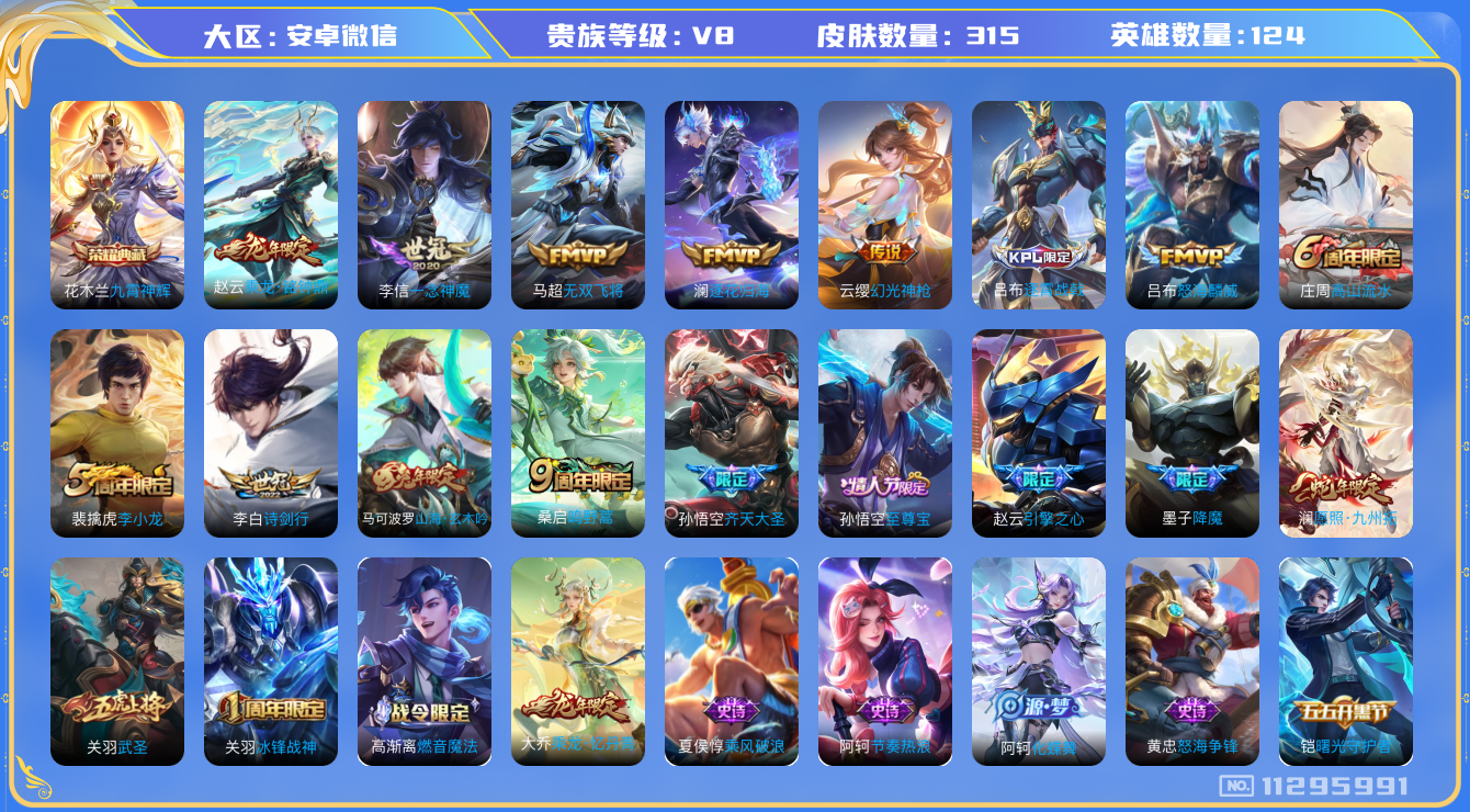 [11295991]V8 1典藏 12传说 124英雄 315皮肤 可修改实名 安全保护中 荣耀水晶:九霄神辉(木兰典藏) 传说皮:乘龙·铭钟鼎(赵云年限),幻光神枪,一念神魔,无双飞将,澜逐花归海 珍宝阁皮:妄想食味 限定皮:愿照·九州拓(澜年限),逐霄战戟,鸣野蒿,至尊宝,高山流水,诗剑行,齐天大圣,怒海麟威,降魔,冰锋战神,武圣,李小龙,引擎之心,山海·玄木吟(马可年限) 史诗皮:百相守梦-百里守约,星界战将,茶境仙,器灵·浮梦炉,化蝶舞,鸭鸭历险记-刘禅,龙之律动,芈月浮光幕影,怒海争锋,蔬乡物语(鲁班七号),乘龙·聚宝船(安琪拉年限),乘龙·忆丹青(大乔年限),琥珀纪元伽罗,破空之剑,紫霞仙子,黄金分割率,特工魅影,千年之狐,电玩·爆裂旋风,冰冠公主,匿光侦查者,江河有灵,百解令(蒙犽),高渐离燃音魔法,蒙恬荣光圣徽,魅语,末日机甲-吕布,猫狗日记-孙策,时之恋人-孙尚香,乱世虎臣,节奏热浪,修罗,女仆咖啡,水果甜心,绅士熊喵,心灵骇客,功夫厨神,暗隐猎兽者,幽灵船长,鬼剑武藏,心灵战警,乐园奇幻夜,天秀·启明,舞动绿茵,地狱岩魂,纤云弄巧,拒霜思,缤纷独角兽,乘风破浪,逐浪之夏,水晶猎龙者,曙光守护者,箭羽风息,金属风暴,原初追逐者,圣诞狂欢,圣诞恋歌,鹰眼统帅,暗夜贵公子,魅力维加斯,黎明之约,无心,未来纪元-赵云