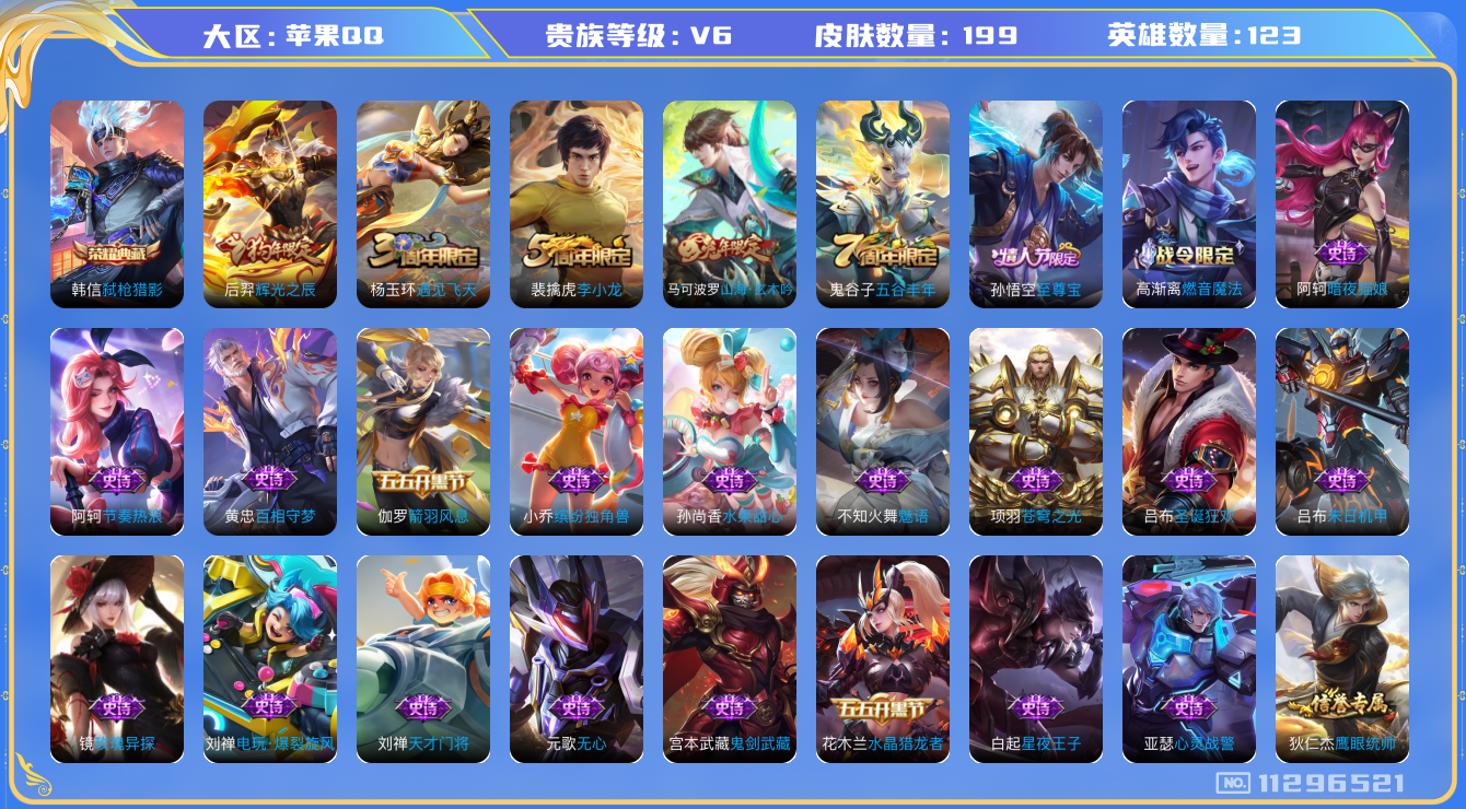 [11296521]V6 1典藏 123英雄 199皮肤 可修改实名 优质装备:弑枪猎影(韩信典藏) 珍宝阁皮:胡桃夹子 限定皮:至尊宝,遇见飞天,五谷丰年,李小龙,辉光之辰,山海·玄木吟(马可年限) 史诗皮:龙之律动,百相守梦-黄忠,苍穹之光,电玩·爆裂旋风,高渐离燃音魔法,蒙恬荣光圣徽,偶像歌手,暗夜猫娘,魅语,末日机甲-吕布,节奏热浪,修罗,女仆咖啡,水果甜心,天才门将,星夜王子,鬼剑武藏,心灵战警,繁星吟游(呼啦呼啦),缤纷独角兽,逐浪之夏,水晶猎龙者,箭羽风息,金属风暴,原初追逐者,圣诞狂欢,鹰眼统帅,魅力维加斯,无心,玫瑰异探