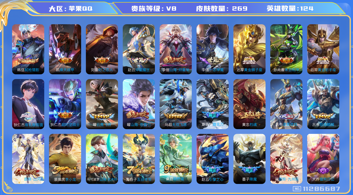 [11286687]V8 1典藏 19传说 124英雄 269皮肤 可修改实名 优质装备:弑枪猎影(韩信典藏),黄金狮子座,黄金射手座,云鹰飞将(小将军),绛天战甲(鸡嘴战神),一念神魔,末日机甲-孙尚香(绿蚂蚱),时之恋人-刘备(电焊工),淬星耀世,超时空战士-狄仁杰,无双飞将,山海·炽霜斩(李信年限),山海·苍雷引(电光曜子),夜礼服假面 珍宝阁皮:胡桃夹子,玩趣恶龙 限定皮:愿照·九州拓(澜年限),愿照·山河定(司空震年限),逐霄战戟,鸣野蒿,夏侯惇霜北刀,怒海麟威,降魔,五谷丰年,烈魂,李小龙,引擎之心,山海·玄木吟(马可年限) 史诗皮:鸭鸭历险记-刘禅,化蝶舞,星界特工,龙之律动,藏狐·褐绒,百相守梦-周瑜,茶境仙,蒙犽顽岩魄,埋骨钱,百相守梦-百里守约,百相守梦-黄忠,紫霞仙子,特工魅影,千年之狐,永昼,江河有灵,蒙恬荣光圣徽,偶像歌手,暗夜猫娘,魅语,无限星赏官,末日机甲-吕布,猫狗日记-大乔,乱世虎臣,修罗,女仆咖啡,摇滚巨星,水果甜心,绅士熊喵,暗隐猎兽者,鬼剑武藏,暗渊魔法,心灵战警,舞动绿茵,纤云弄巧,缤纷独角兽,乘风破浪,逐浪之夏,龙鼓争鸣,水晶猎龙者,曙光守护者,热力回旋,箭羽风息,金属风暴,原初追逐者,圣诞恋歌,鹰眼统帅,魅力维加斯,赏金猎手,无心,未来纪元-赵云