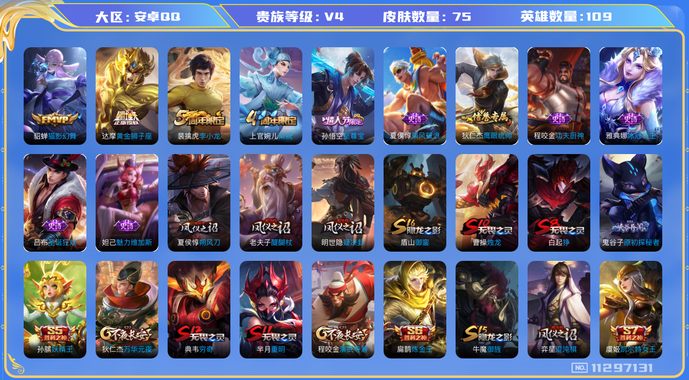 [11297131]V4 2传说 109英雄 75皮肤 可修改实名 优质装备:黄金狮子座,猫影幻舞 限定皮:至尊宝,梁祝,李小龙 史诗皮:冰冠公主,功夫厨神,乘风破浪,圣诞狂欢,鹰眼统帅,魅力维加斯