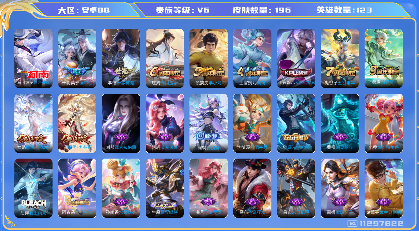 [11297822]V6 1珍品传说 5传说 123英雄 196皮肤 可修改实名 珍品传说:怪盗基德 传说皮:一念神魔,画中仙 珍宝阁皮:蔷薇恋人,女武神 限定皮:愿照·九州拓(澜年限),愿照·千秋盛(女娲年限),鸣野蒿,高山流水,五谷丰年,梁祝,天狼绘梦者,李小龙 史诗皮:星界战将,苍鳞隐世,谪仙醉月,龙之律动,石田雨龙,百相守梦-百里守约,化蝶舞,破空之剑,紫霞仙子,黄金分割率,千年之狐,永昼,浮梦罗烟,江河有灵,蒙恬荣光圣徽,偶像歌手,电玩·爆裂旋风,末日机甲-吕布,节奏热浪,修罗,女仆咖啡,水果甜心,天才门将,星夜王子,德古拉伯爵,暗隐猎兽者,幽灵船长,鬼剑武藏,舞动绿茵,繁星吟游(呼啦呼啦),拒霜思,缤纷独角兽,月团寄思,水晶猎龙者,曙光守护者,唤灵魅影,金属风暴,原初追逐者,圣诞狂欢,鹰眼统帅,暗夜贵公子,魅力维加斯,黎明之约,无心