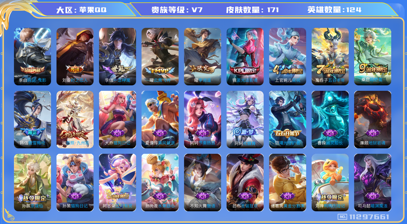 [11297661]V7 1典藏 6传说 124英雄 171皮肤 可修改实名 优质装备:鸣剑·曳影,云鹰飞将(小将军),一念神魔,李逍遥,时之恋人-刘备(电焊工) 珍宝阁皮:万物之道,玩趣恶龙 限定皮:愿照·九州拓(澜年限),鸣野蒿,傲雪梅枪,五谷丰年,梁祝,匿光追影者 史诗皮:鸭鸭历险记-刘禅,化蝶舞,龙之律动,茶境仙,黄金分割率,千年之狐,永昼,江河有灵,百解令(蒙犽),偶像歌手,魅语,猫狗日记-孙策,猫狗日记-大乔,节奏热浪,水果甜心,绅士熊喵,天才门将,星夜王子,心灵骇客,功夫厨神,暗隐猎兽者,幽灵船长,鬼剑武藏,暗渊魔法,乐园奇幻夜,天秀·启明,地狱岩魂,乘风破浪,逐浪之夏,水晶猎龙者,曙光守护者,金属风暴,原初追逐者,圣诞狂欢,鹰眼统帅,暗夜贵公子,魅力维加斯,黎明之约,无心